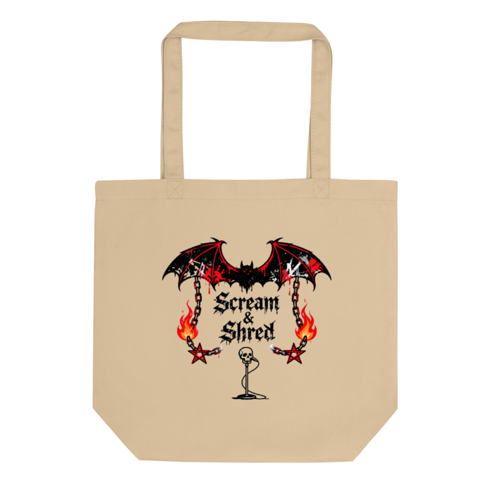 Sustainable eco-friendly tote bag made from organic cotton. Features bold ‘Scream & Shred’ bat design with chains, flames, skull, and pentagram—perfect for rock fans and horror enthusiasts. Lightweight, durable, and reusable. Supports eco-conscious living without compromising on edgy style.