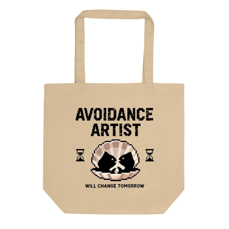 This eco-friendly tote bag features a pixel-art oyster design with two fish and hourglasses, paired with the bold text ‘AVOIDANCE ARTIST WILL CHANGE TOMORROW’. Made from sustainable canvas, it’s a practical, stylish accessory for everyday use. The minimalist beige tone complements the striking black-and-beige graphic, ideal for conscious shoppers seeking ethical fashion. Durable handles and spacious interior make it perfect for groceries, work, or travel.