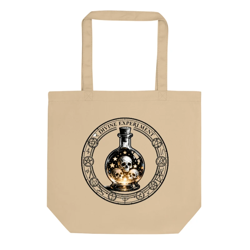 This Eco Oyster Tote Bag features a striking ‘Divine Experiment’ design: a vintage-style flask holding three skulls against a starry, golden backdrop, encircled by occult symbols. Crafted from durable, eco-friendly canvas, it’s a stylish, sustainable accessory for everyday use. The bold, artistic print makes a statement—ideal for gothic, witchy, or mystical fashion lovers seeking ethical, high-quality bags.