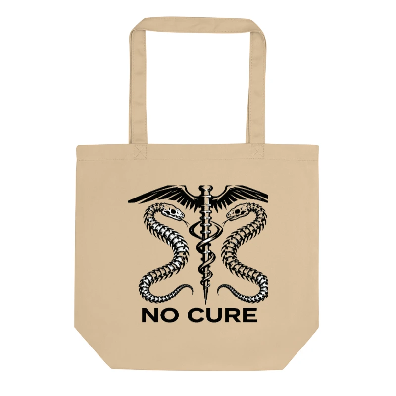 Handcrafted eco-friendly tote bag made from sustainable cotton canvas. Features a bold black-and-white ‘No Cure’ caduceus design with two skeletal snakes and winged staff—ideal for medical professionals, students, or advocates of health awareness. Lightweight, durable, and reusable. Supports eco-conscious living without compromising style.