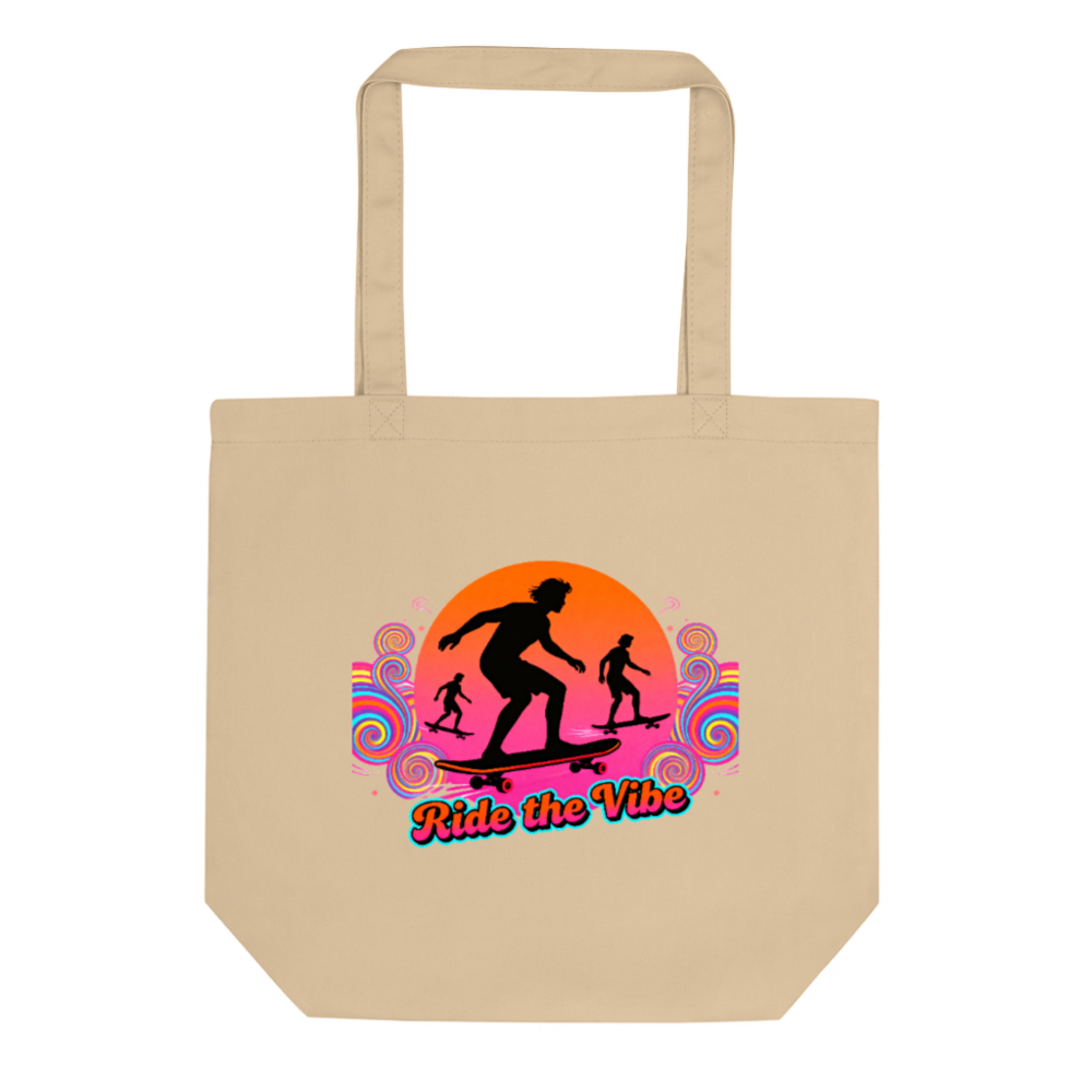 This Eco Oyster Tote Bag features a vibrant, retro-inspired ‘Ride the Vibe’ design with skateboarder silhouettes against a sunset swirl. Made from durable, eco-friendly canvas for everyday use. Lightweight, reusable, and stylish—perfect for shopping, travel, or as a statement accessory. Designed to reduce single-use plastic without compromising on fun, bold aesthetics.