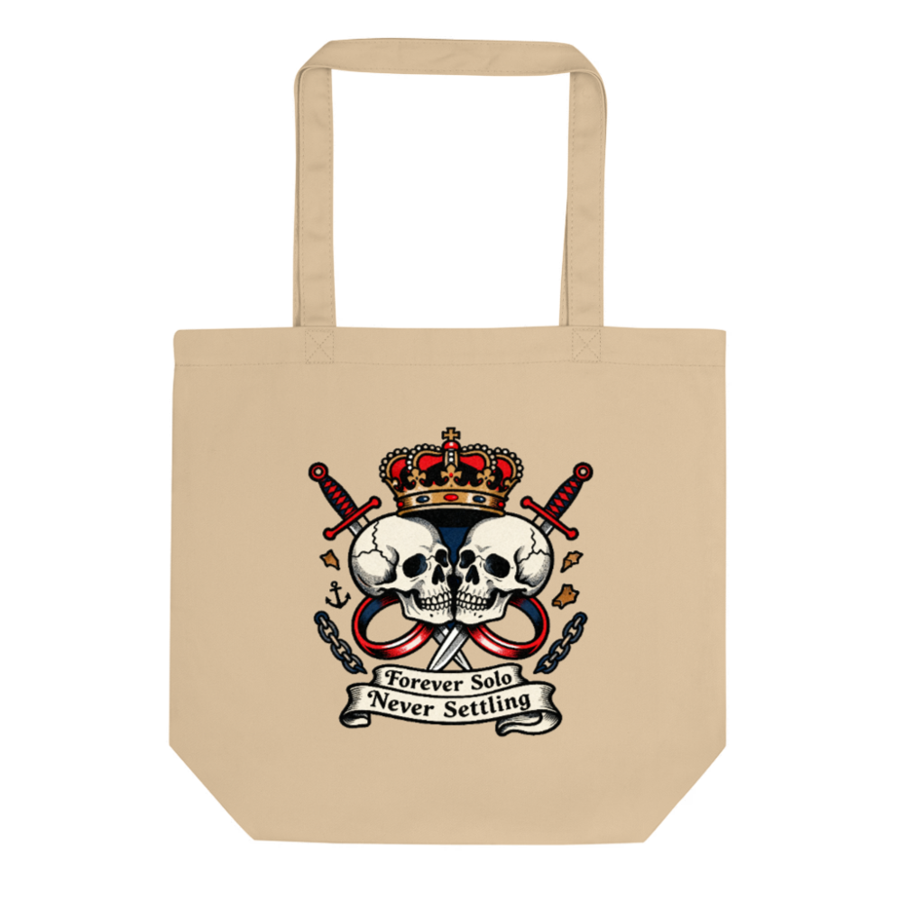 This Eco Oyster Tote Bag features a bold vintage-inspired design: two skulls, crossed swords, a regal crown, anchor, and chains—symbolizing resilience and individuality. Made from durable, eco-conscious canvas, it’s designed for everyday use with a sustainable ethos. The tagline ‘Forever Solo Never Settling’ reinforces its empowering message. Lightweight, reusable, and ethically crafted for conscious consumers seeking style and substance.