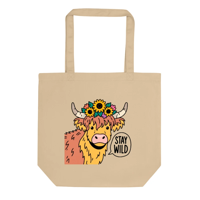 Eco Oyster Tote Bag | Sustainable Canvas Tote with Wild Cow Design & ‘Stay Wild’ Quote
