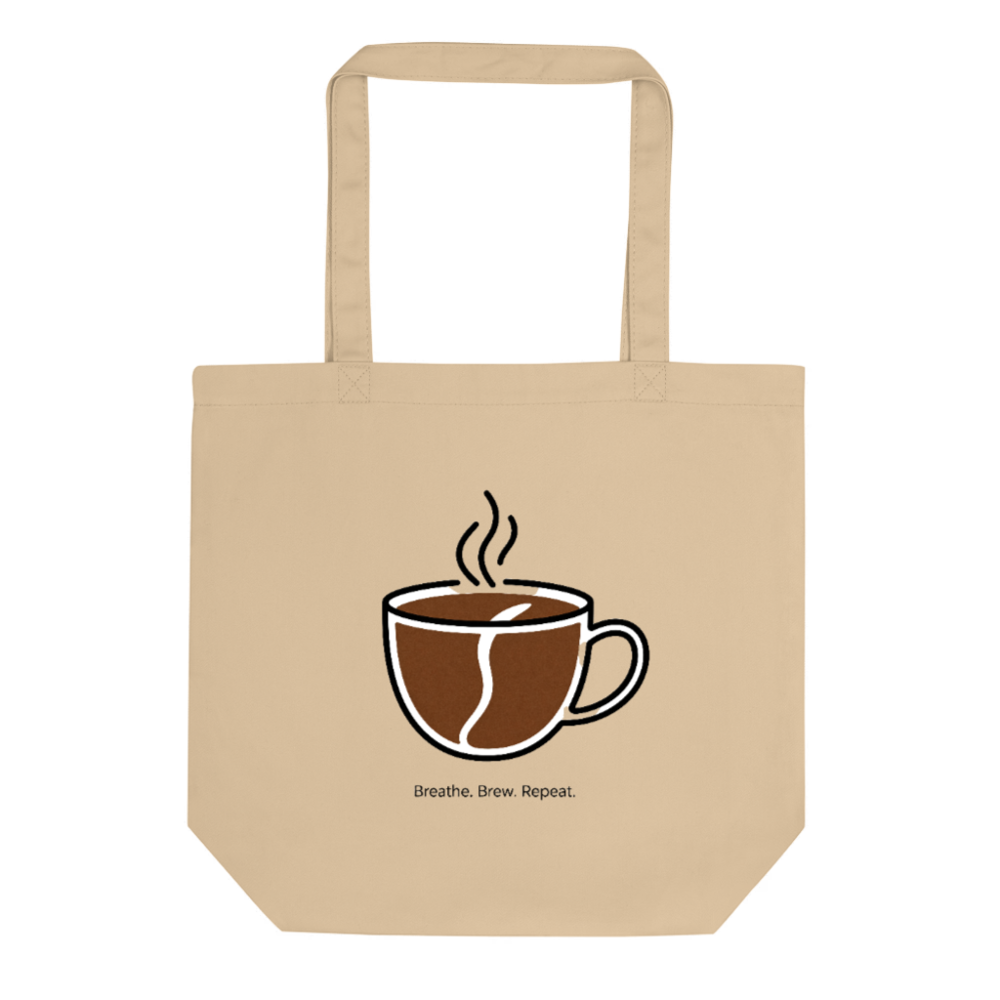 Eco Oyster Tote Bag | Sustainable Cotton Tote with Coffee Cup Design & Breathe. Brew. Repeat. Motto