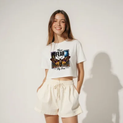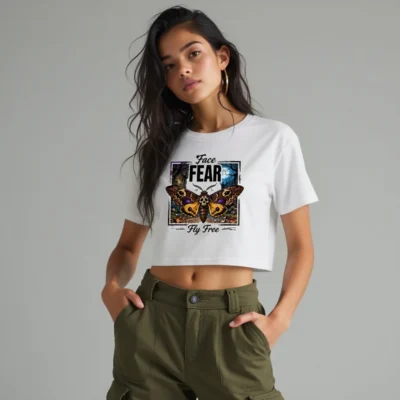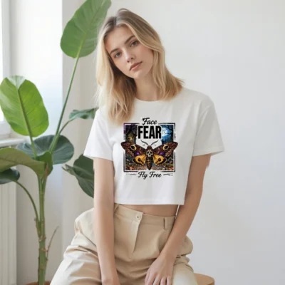 This edgy women’s cropped top features a striking gothic design: a detailed death’s-head hawkmoth with skull thorax, set against a haunted forest backdrop. Bold text reads ‘Face Fear’ and ‘Fly Free’, blending dark aesthetics with empowering messaging. Made from soft, breathable cotton blend, it offers a relaxed fit with rolled hems—perfect for layering or solo wear. Ideal for alternative fashion lovers, Halloween, festivals, or everyday bold style. Machine washable, true to size. No certifications claimed beyond standard garment labeling.