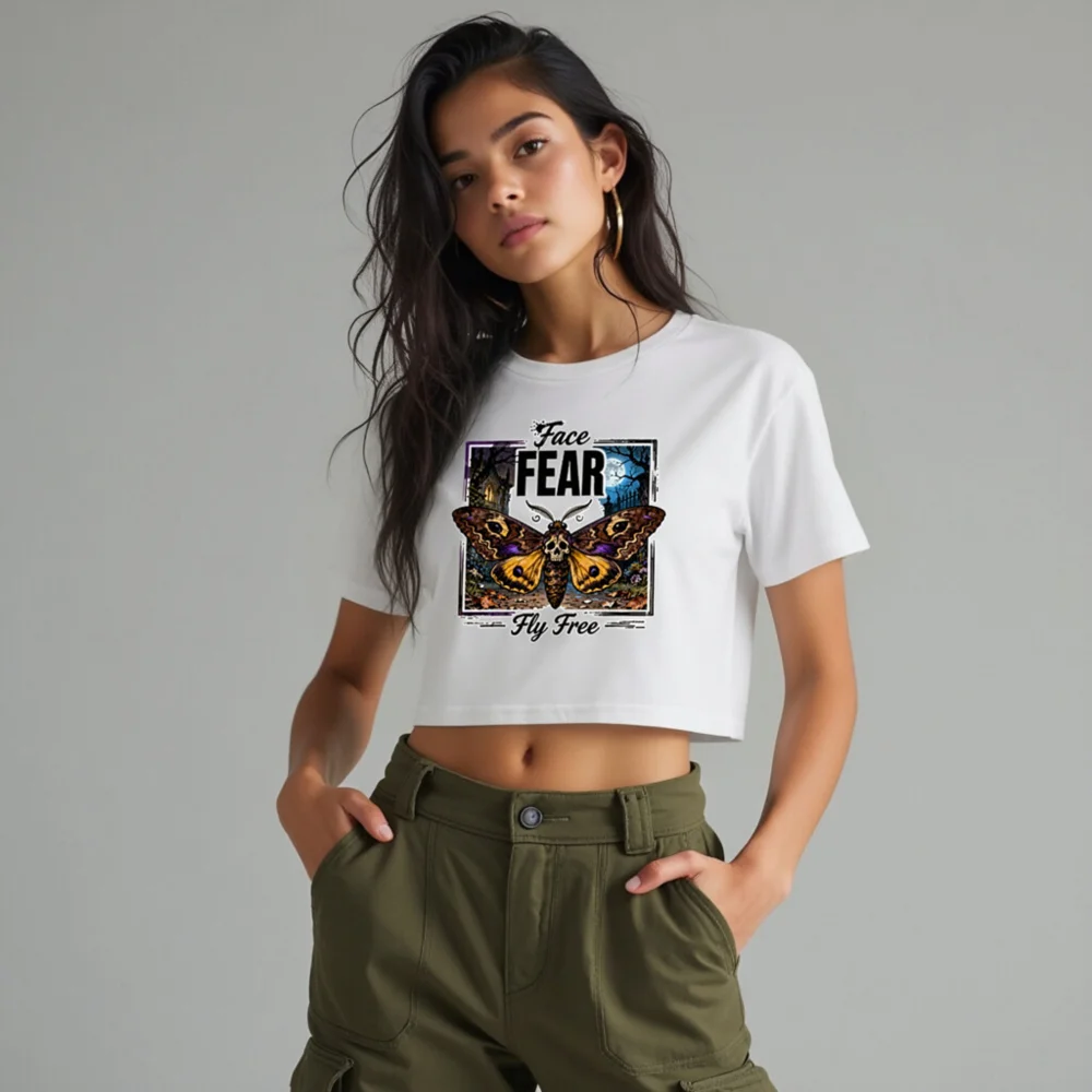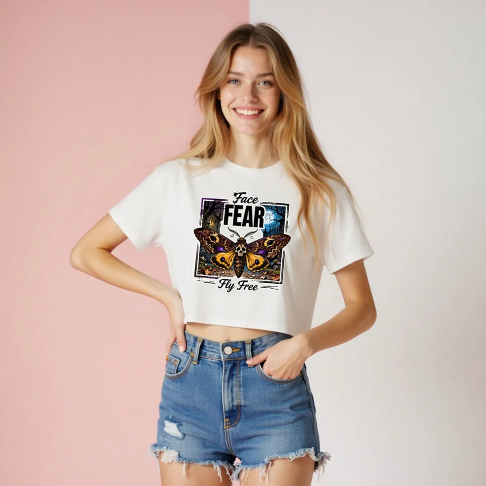 Face Fear Fly Free Crop Top for Women – Gothic Moth Skull Graphic Tee