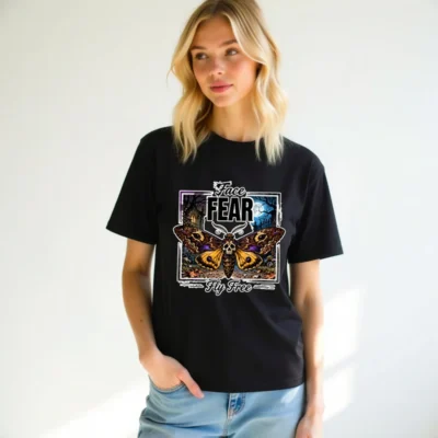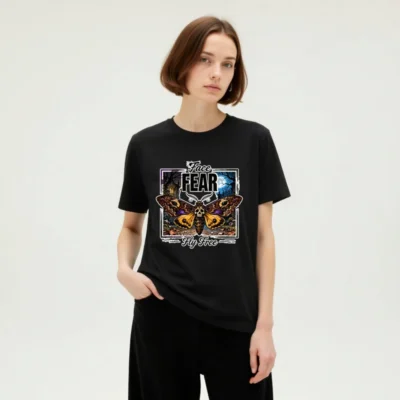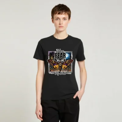 Boldly express your spirit with this unisex organic cotton t-shirt featuring a striking ‘Face Fear, Fly Free’ design—a skull-headed moth against a haunting moonlit forest. Made from soft, eco-friendly 100% organic cotton, it offers comfort and durability for everyday wear. Perfect for fans of gothic art, alternative fashion, or empowering symbolism. Ethically produced, tagless neckline, pre-shrunk fit. Ideal for layering or wearing solo—stand out while staying sustainable.