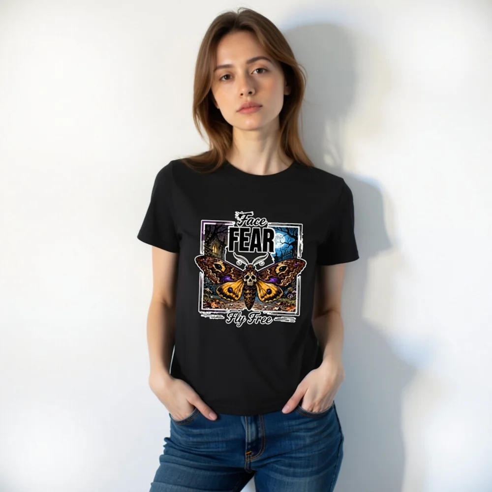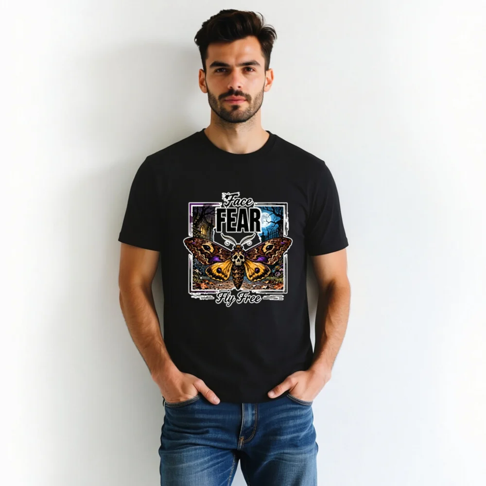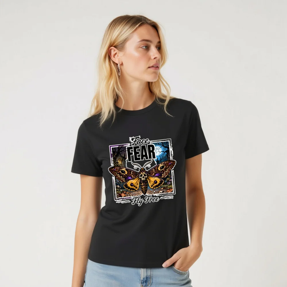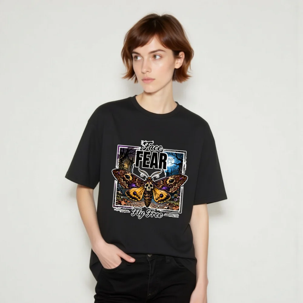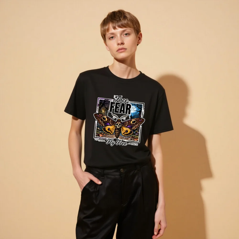 Boldly express your spirit with this unisex organic cotton t-shirt featuring a striking ‘Face Fear, Fly Free’ design—a skull-headed moth against a haunting moonlit forest. Made from soft, eco-friendly 100% organic cotton, it offers comfort and durability for everyday wear. Perfect for fans of gothic art, alternative fashion, or empowering symbolism. Ethically produced, tagless neckline, pre-shrunk fit. Ideal for layering or wearing solo—stand out while staying sustainable.