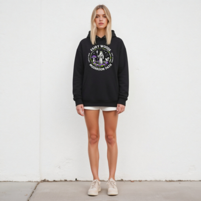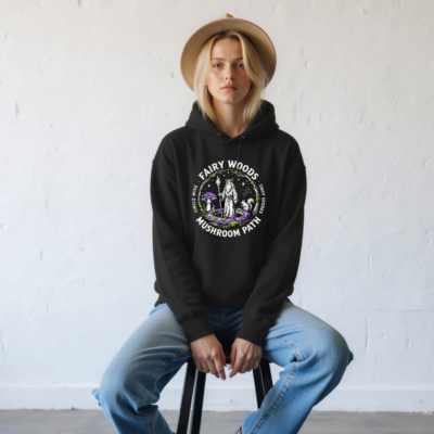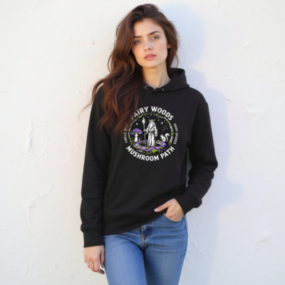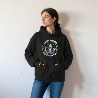 Wear the magic of the Fairy Woods with this unisex essential eco hoodie. Featuring a whimsical design of a woodland sage, purple mushroom path, squirrel, and forest flora—printed with eco-friendly inks on sustainable fabric. ‘Circle Wise’ and ‘Sniff Spores’ add playful enchantment. Designed for comfort, versatility, and earth-conscious style. Perfect for nature lovers, fantasy fans, and everyday wear.