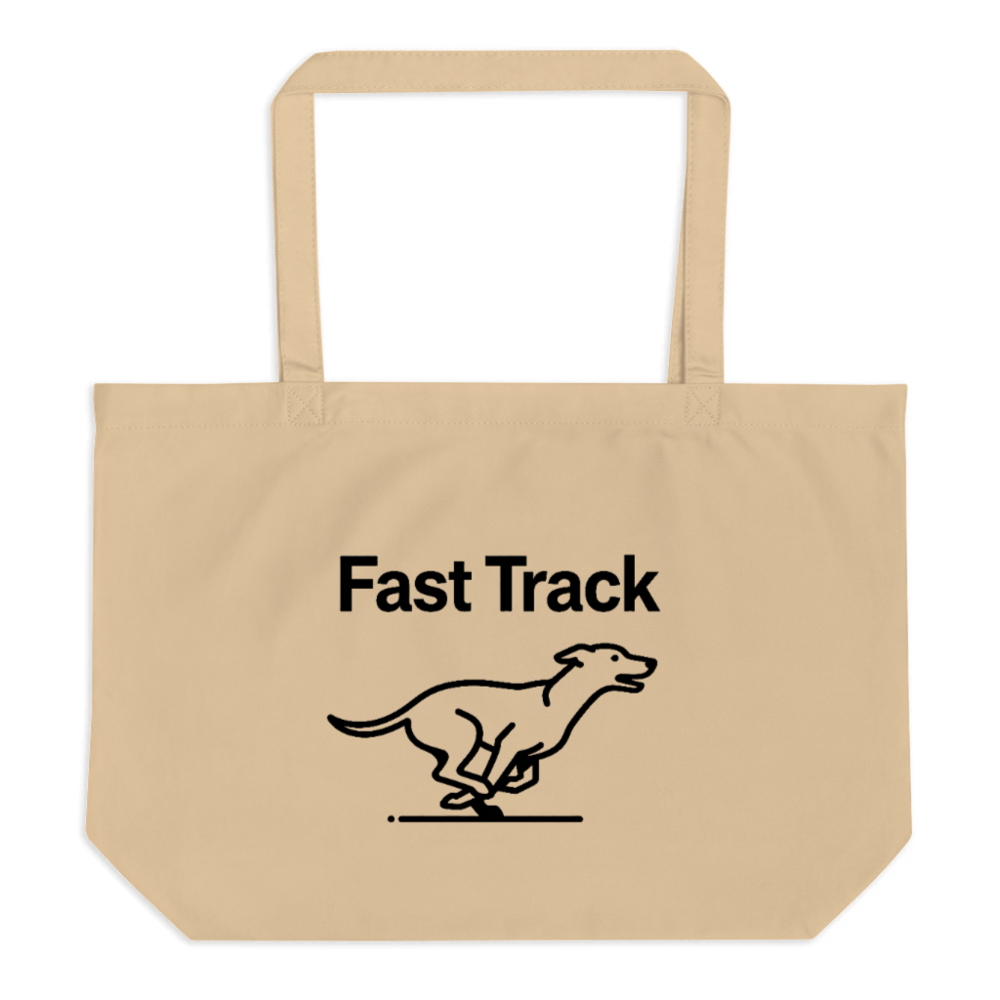 Large organic tote bag featuring a bold ‘Fast Track’ design with a running dog illustration. Made from sustainable, certified organic cotton for eco-conscious shoppers. Lightweight, durable, and perfect for everyday use—carry your values with style. Ideal for shopping, work, or travel. 100% organic cotton construction; no synthetic additives.