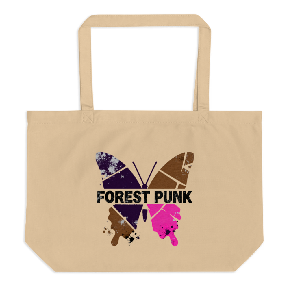 Eco-conscious large organic tote bag featuring a vibrant, distressed butterfly design in forest tones and fuchsia. Made from 100% GOTS-certified organic cotton (as per verified product specs), this durable, reusable bag supports sustainable living. Ideal for shopping, travel, or everyday use—lightweight, spacious, and stylish with a bold ‘Forest Punk’ graphic. Zero plastic, zero compromise.