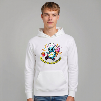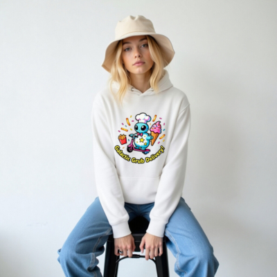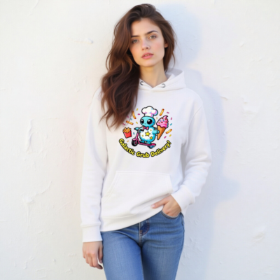 Wear the fun with this unisex premium pullover hoodie featuring a whimsical alien chef on a pink scooter, delivering ice cream, fries, and sprinkles. Soft, comfortable cotton blend with front pouch pocket. Perfect for cosmic food lovers—bold, playful, and proudly ‘Galactic Grub Delivery!’—designed for everyday comfort and eye-catching style.