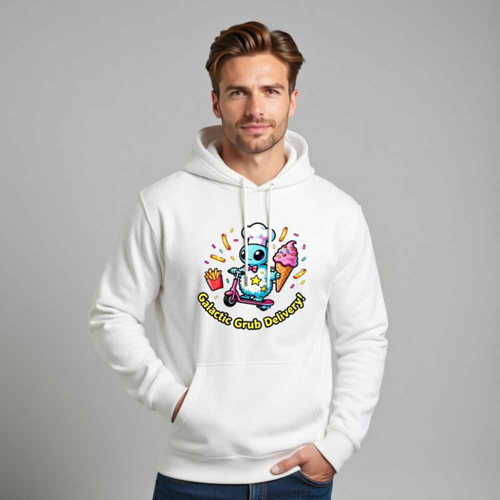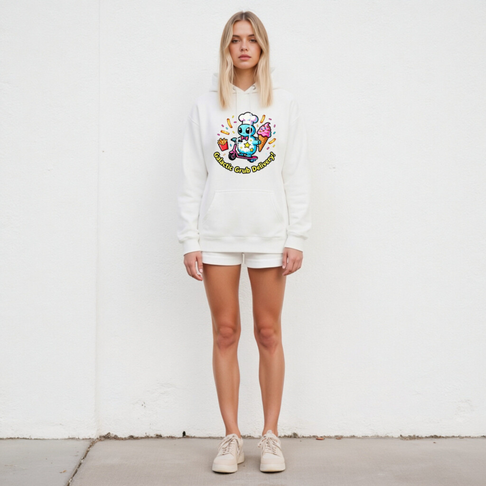 Wear the fun with this unisex premium pullover hoodie featuring a whimsical alien chef on a pink scooter, delivering ice cream, fries, and sprinkles. Soft, comfortable cotton blend with front pouch pocket. Perfect for cosmic food lovers—bold, playful, and proudly ‘Galactic Grub Delivery!’—designed for everyday comfort and eye-catching style.