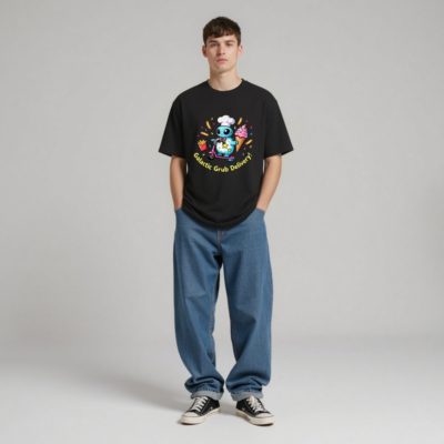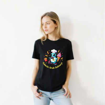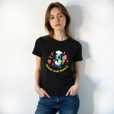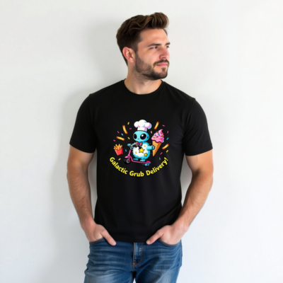 A fun, unisex staple t-shirt featuring a cute blue alien chef riding a pink scooter, delivering cosmic snacks: fries, ice cream, and sprinkles. Perfect for food lovers and space fans. Soft cotton blend, comfortable fit, versatile for everyday wear. Ideal gift for sci-fi & foodie enthusiasts. Bold, playful design with ‘Galactic Grub Delivery!’ slogan.