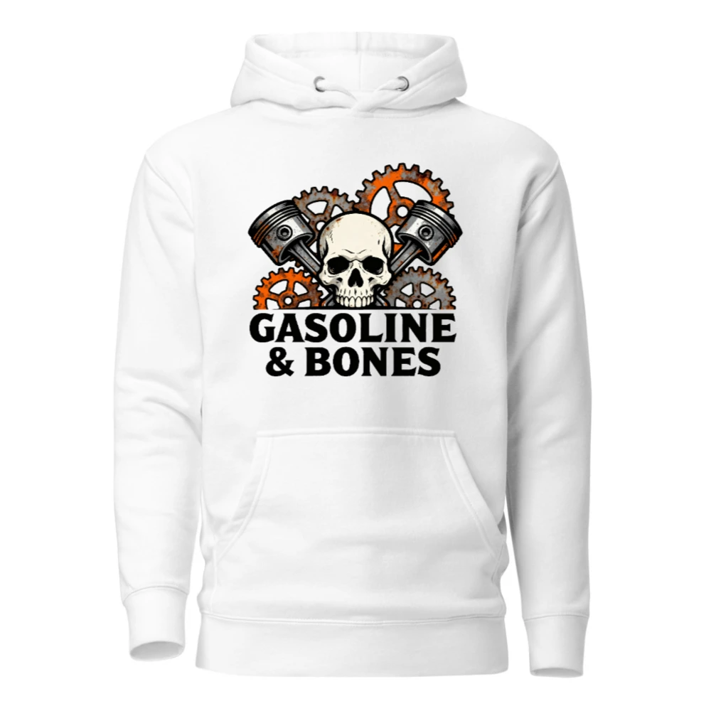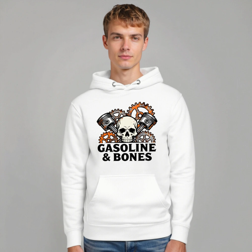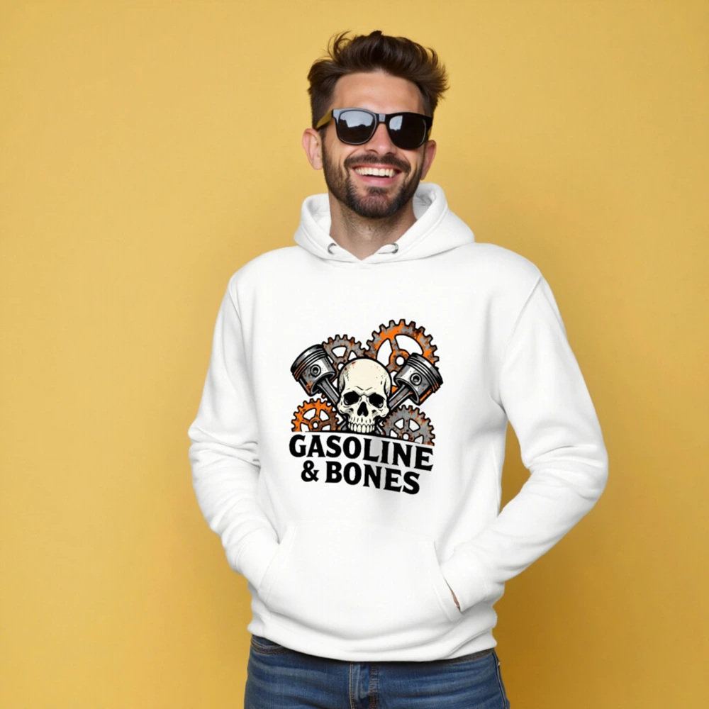 Gasoline & Bones Hoodie – Unisex Premium Pullover with Skull & Engine Gears Design