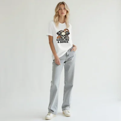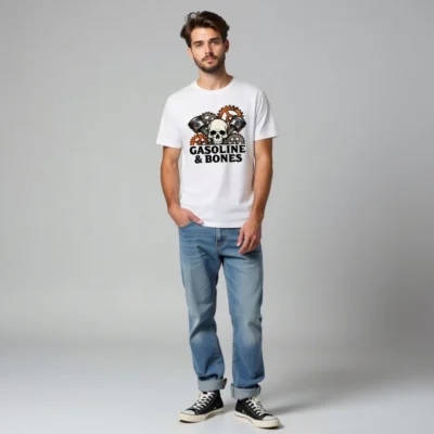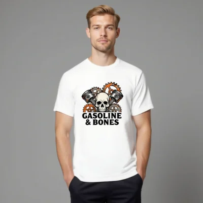Show your engine passion with this unisex staple t-shirt featuring a bold ‘Gasoline & Bones’ graphic: vintage skull flanked by crossed pistons and rust-finished gears. Designed for comfort and durability, it’s perfect for car enthusiasts, mechanics, or anyone who loves automotive style. Soft cotton blend, classic fit, versatile wear.