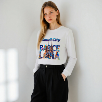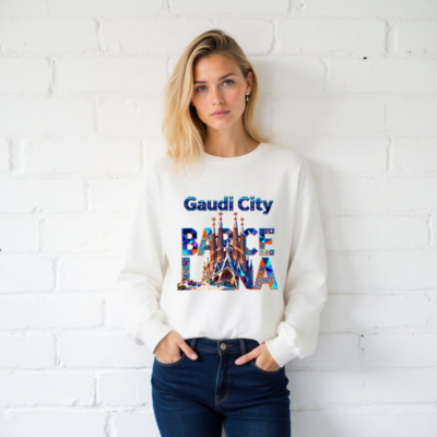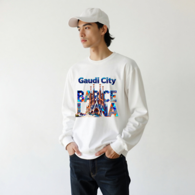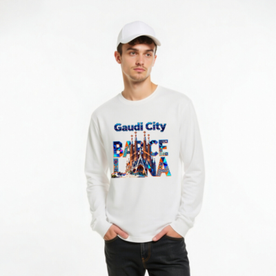 Celebrate Barcelona’s architectural wonder with this unisex long sleeve tee featuring a vibrant, mosaic-style Gaudí cityscape. The design integrates iconic landmarks—Sagrada Família’s spires and Park Güell’s serpentine bench—into bold typography spelling ‘BARCELONA’. Perfect for travelers, architecture lovers, and fans of modern Catalan art. Soft cotton blend, comfortable fit, ideal as a souvenir or everyday statement piece.