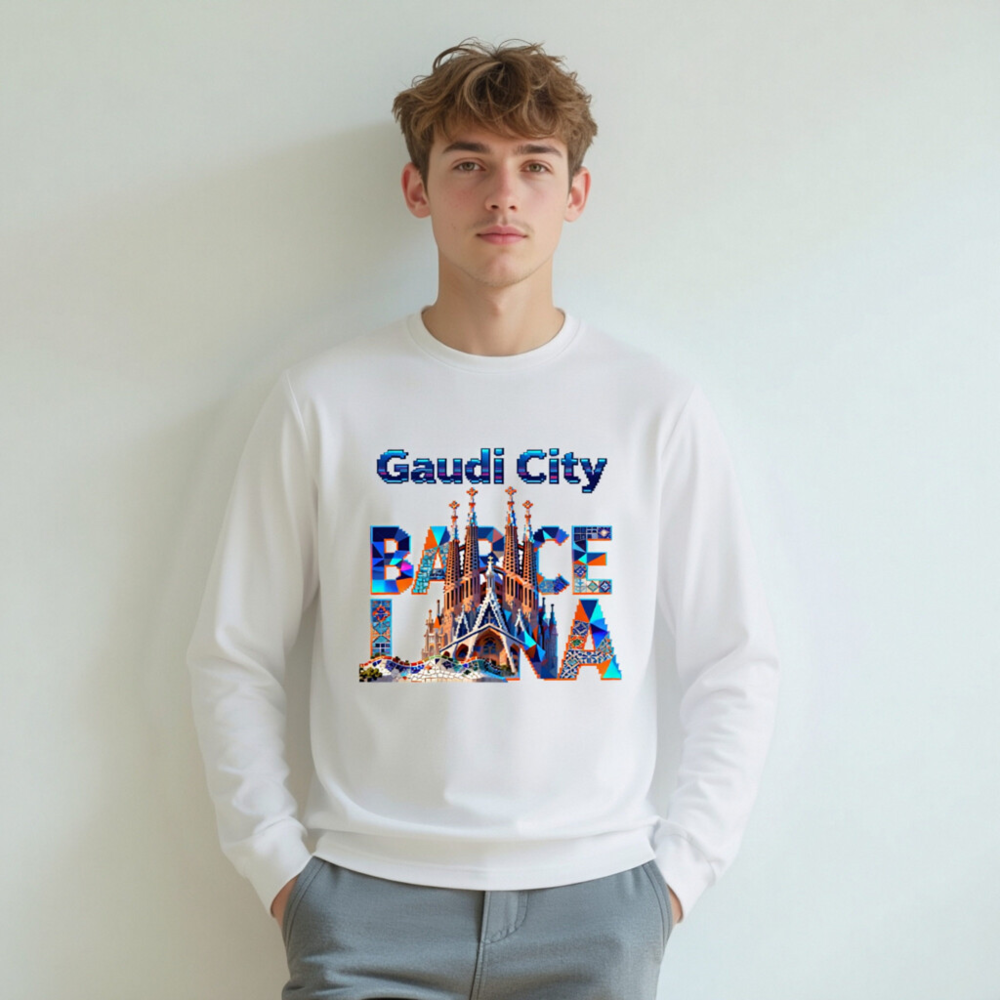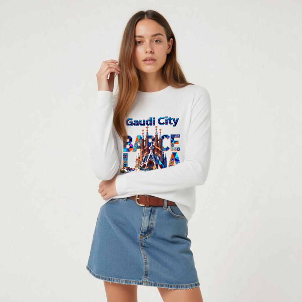 Celebrate Barcelona’s architectural wonder with this unisex long sleeve tee featuring a vibrant, mosaic-style Gaudí cityscape. The design integrates iconic landmarks—Sagrada Família’s spires and Park Güell’s serpentine bench—into bold typography spelling ‘BARCELONA’. Perfect for travelers, architecture lovers, and fans of modern Catalan art. Soft cotton blend, comfortable fit, ideal as a souvenir or everyday statement piece.