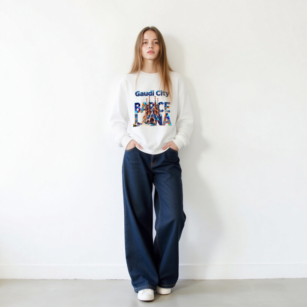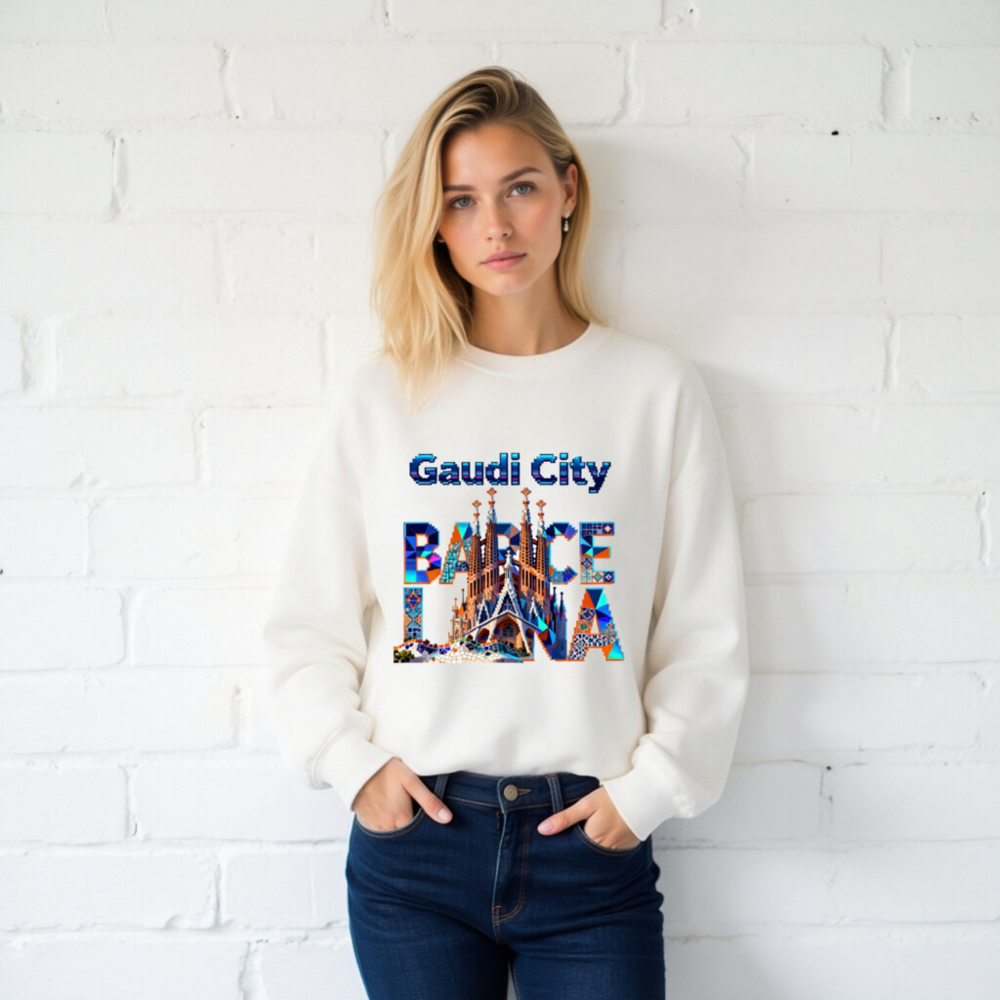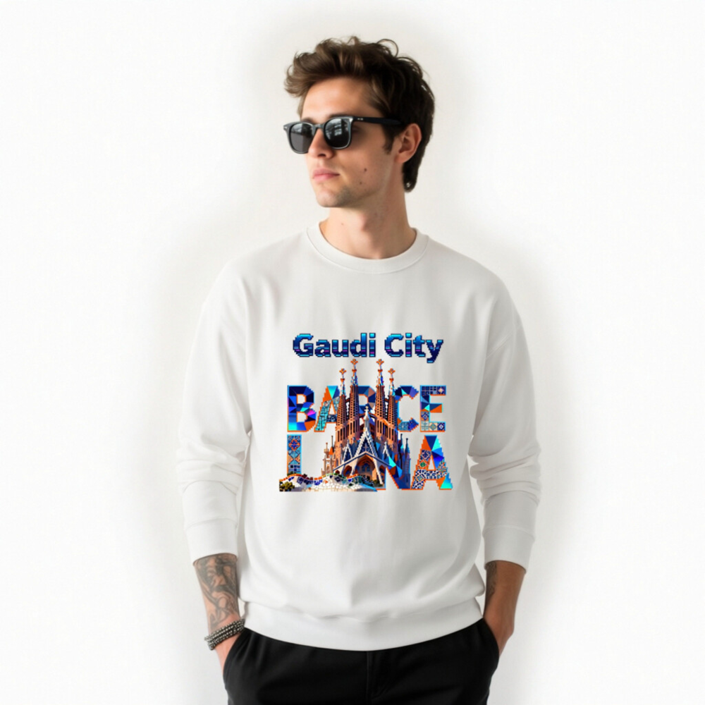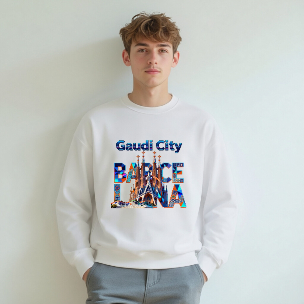 Wear the spirit of Barcelona with this unisex crew neck sweatshirt featuring a vibrant, mosaic-style Gaudí-inspired design. The bold ‘Gaudi City’ and ‘BARCELONA’ typography integrates iconic landmarks like Sagrada Família and Park Güell—perfect for architecture lovers and travelers. Soft cotton blend, comfortable fit, versatile for casual or sightseeing wear. Ideal gift for art & design enthusiasts.