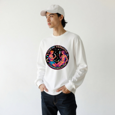 Celebrate Gemini with this vibrant unisex long sleeve tee featuring a cosmic twin design—two figures in dynamic pose against starry backdrop, holding a feather and mirror. Perfect for astrology lovers, zodiac enthusiasts, or anyone embracing duality and communication. Soft cotton blend, comfortable fit, gender-neutral style. Ideal gift for Gemini season or self-expression through horoscope art.