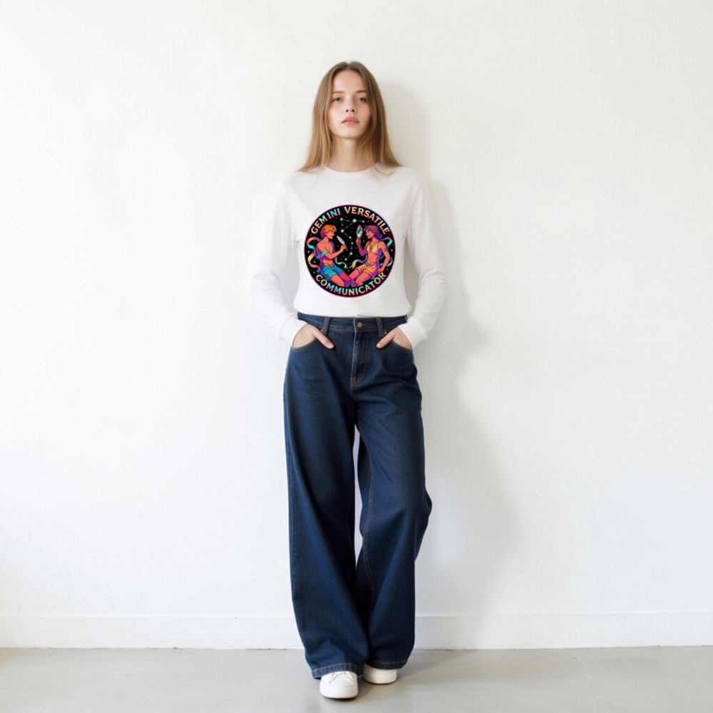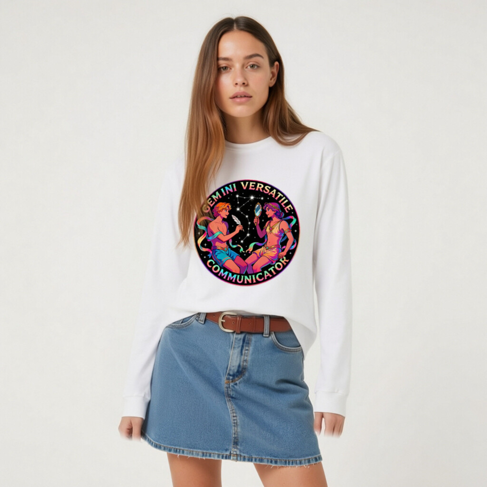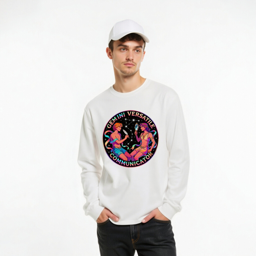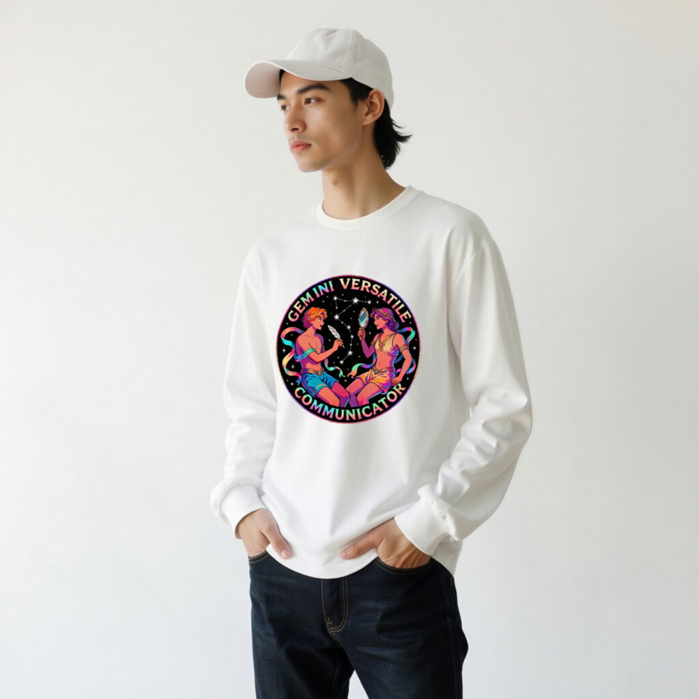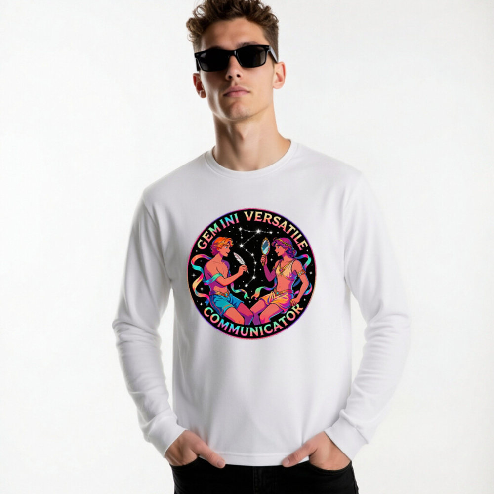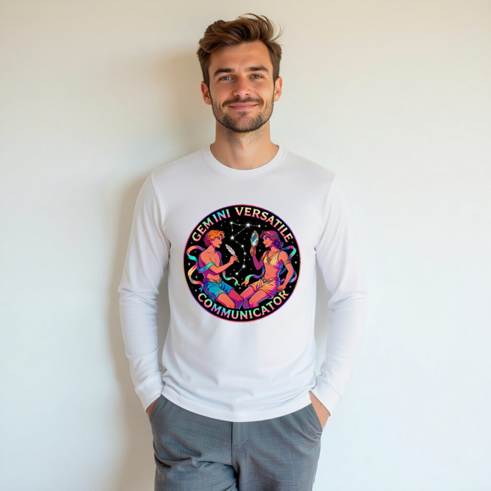 Celebrate Gemini with this vibrant unisex long sleeve tee featuring a cosmic twin design—two figures in dynamic pose against starry backdrop, holding a feather and mirror. Perfect for astrology lovers, zodiac enthusiasts, or anyone embracing duality and communication. Soft cotton blend, comfortable fit, gender-neutral style. Ideal gift for Gemini season or self-expression through horoscope art.