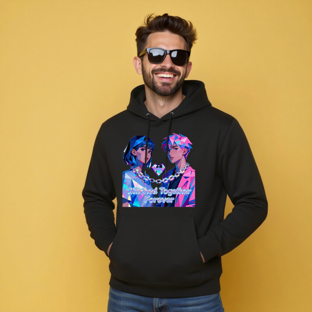 Glitched Together Forever Unisex Eco Hoodie – Pixel Art Couple Design