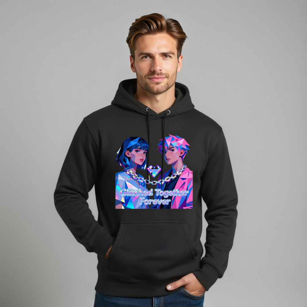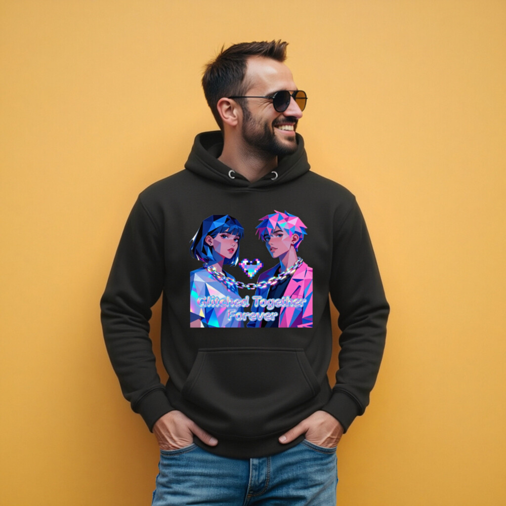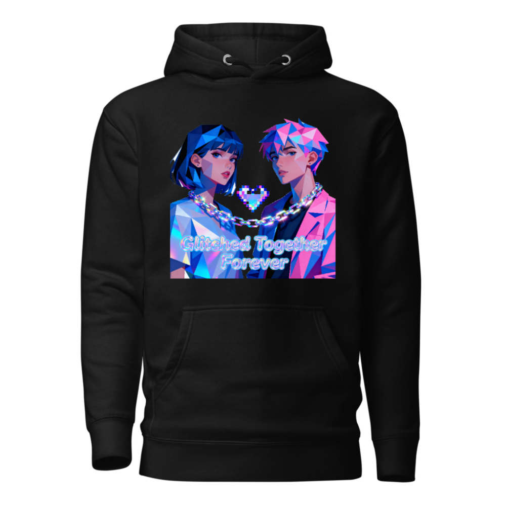 Show your digital romance with this premium unisex pullover hoodie featuring a vibrant, low-poly pixel-art design of two lovers linked by a glitching heart. Crafted for comfort and style, it’s perfect for fans of cyberpunk aesthetics, retro-futurism, and unique self-expression. Soft fabric, durable print, and versatile fit make it ideal for everyday wear or special occasions.