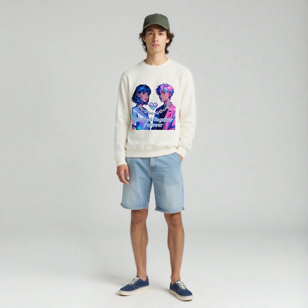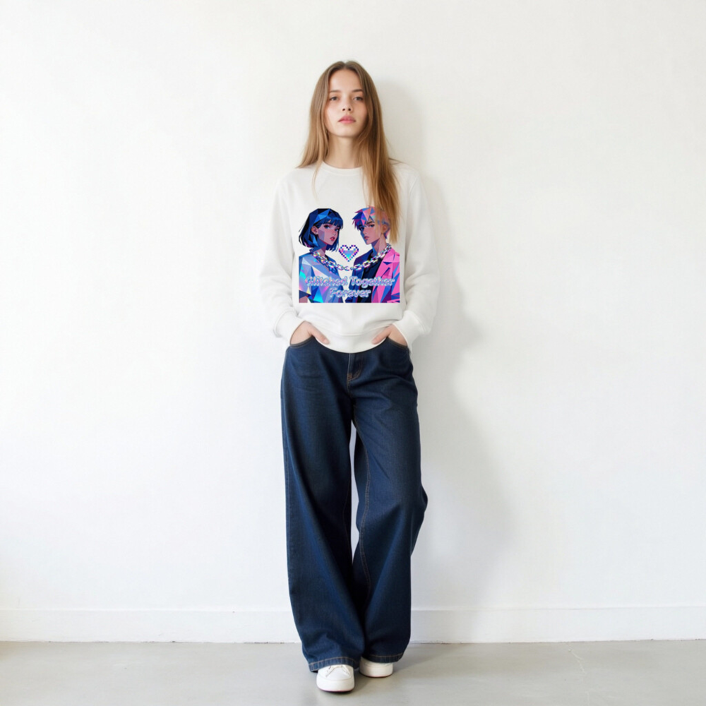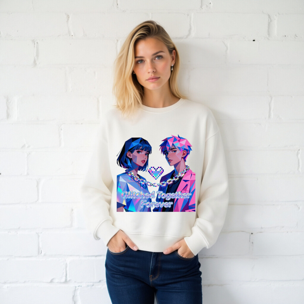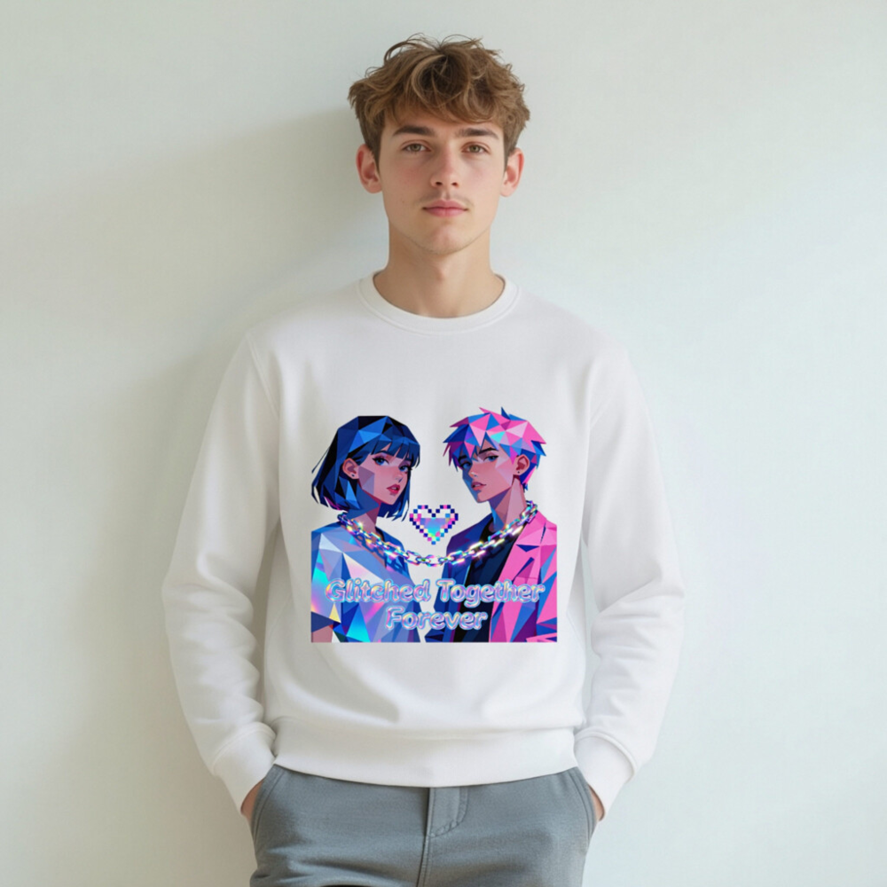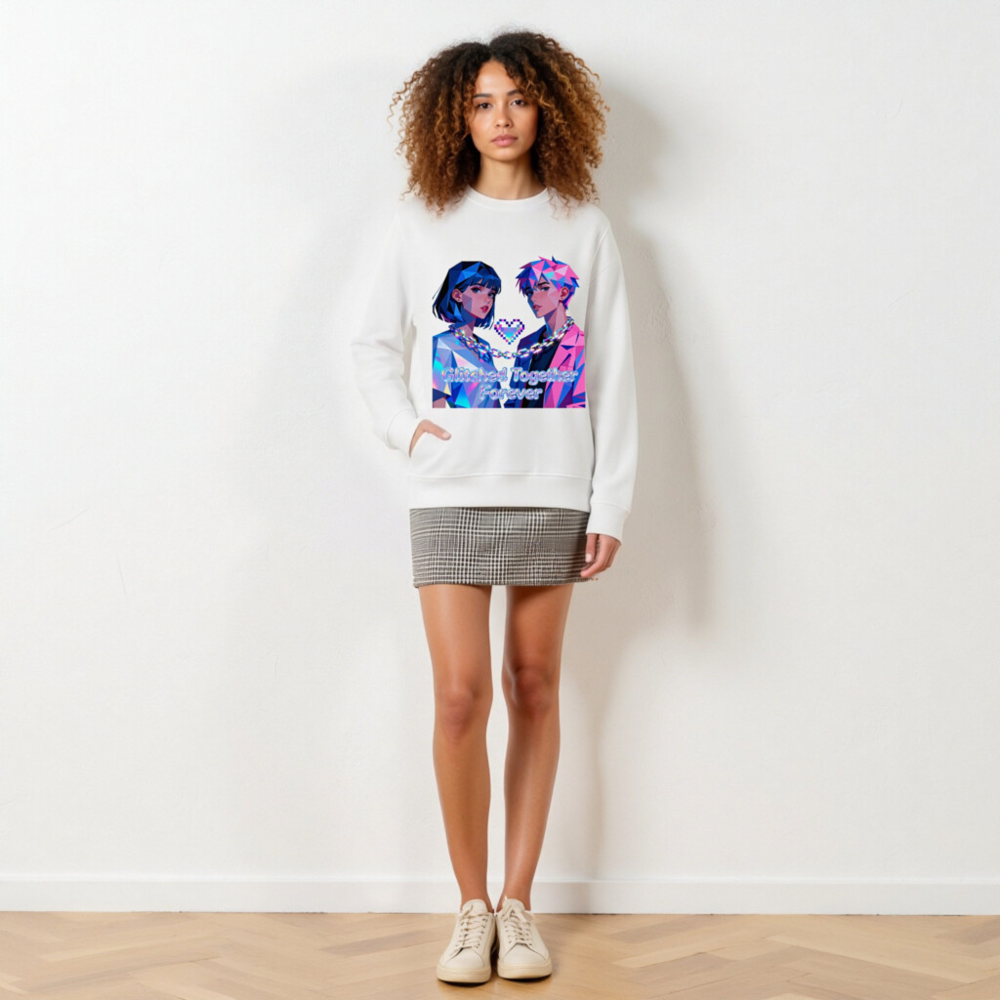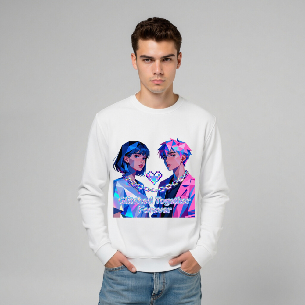 Wear the ‘Glitched Together Forever’ unisex organic sweatshirt—featuring vibrant pixel-art couple design with chain and heart motif. Made from certified organic cotton, this eco-friendly garment offers soft comfort and bold retro-futuristic style. Ideal for lovers of digital art, gaming culture, and sustainable fashion. Sustainable, stylish, and proudly unisex.
