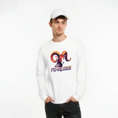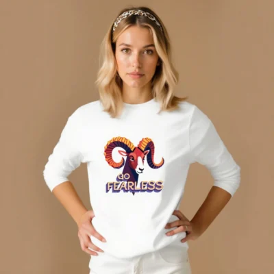 Show your bold spirit with this unisex long sleeve tee featuring a vibrant, stylized ram head graphic and the empowering ‘GO FEARLESS’ text. Designed for comfort and confidence, it’s a versatile piece for everyday wear. The eye-catching design combines warm orange, deep purple, and red tones for a modern, fearless aesthetic. Perfect for those who embrace courage and individuality in their style.