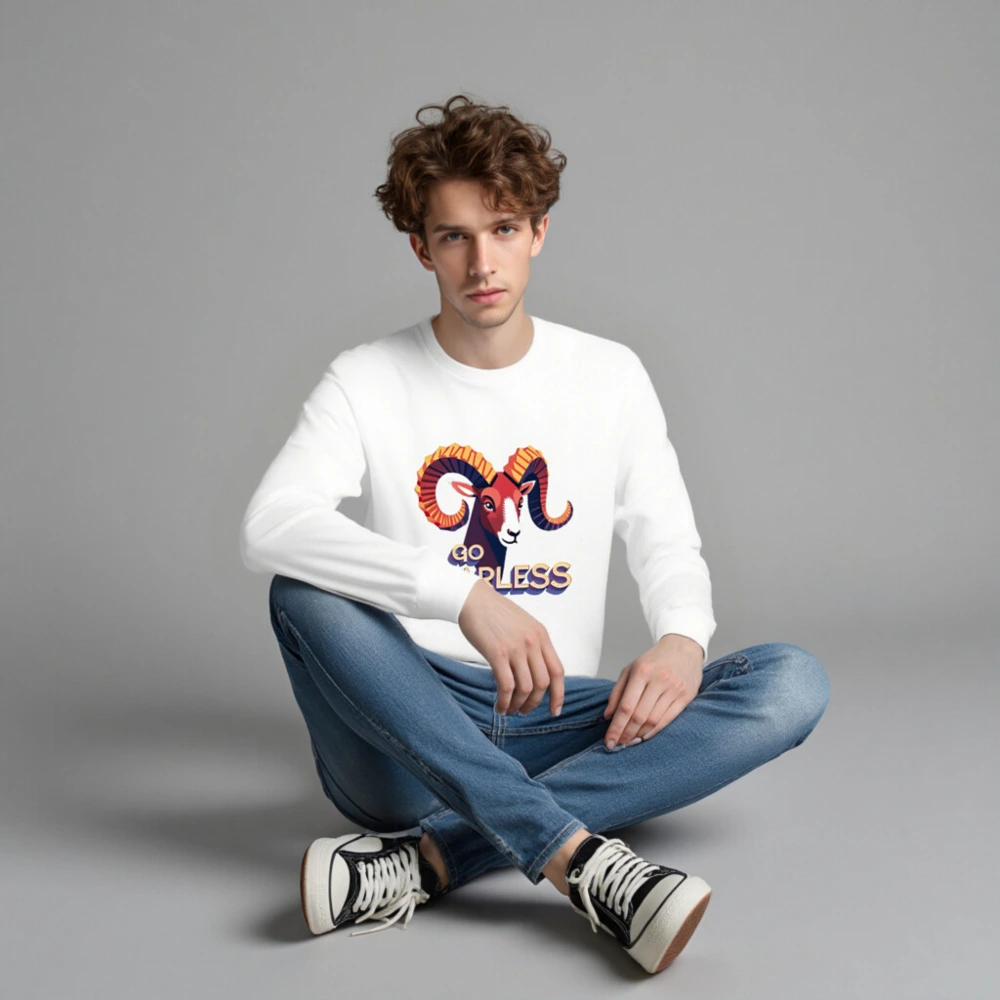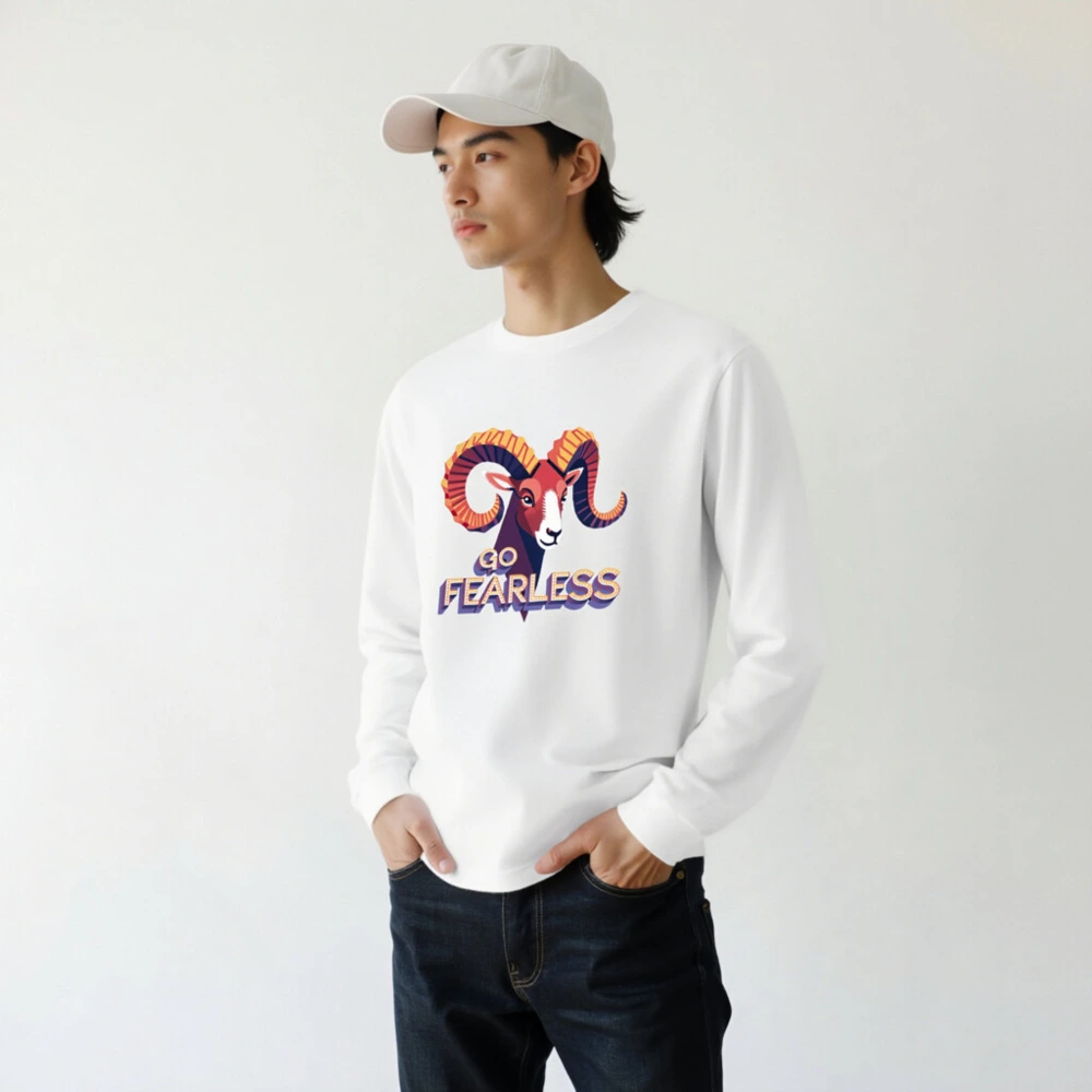 Show your bold spirit with this unisex long sleeve tee featuring a vibrant, stylized ram head graphic and the empowering ‘GO FEARLESS’ text. Designed for comfort and confidence, it’s a versatile piece for everyday wear. The eye-catching design combines warm orange, deep purple, and red tones for a modern, fearless aesthetic. Perfect for those who embrace courage and individuality in their style.
