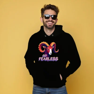 Wear confidence with our Go Fearless unisex essential eco hoodie — featuring a vibrant ram graphic and bold ‘GO FEARLESS’ typography. Made for comfort and sustainability, this essential hoodie combines stylish design with everyday wearability. Perfect for those who embrace courage and individuality. Lightweight, soft, and built to last — your fearless statement piece.