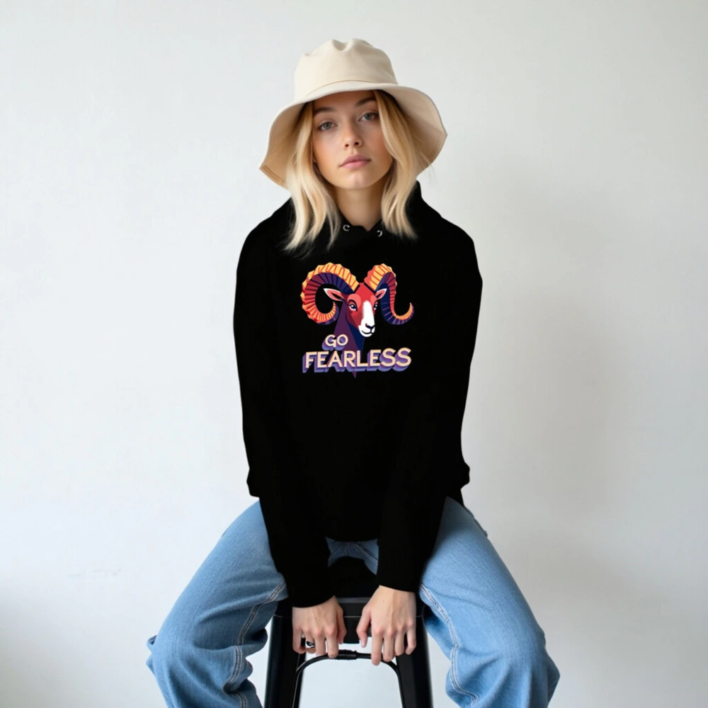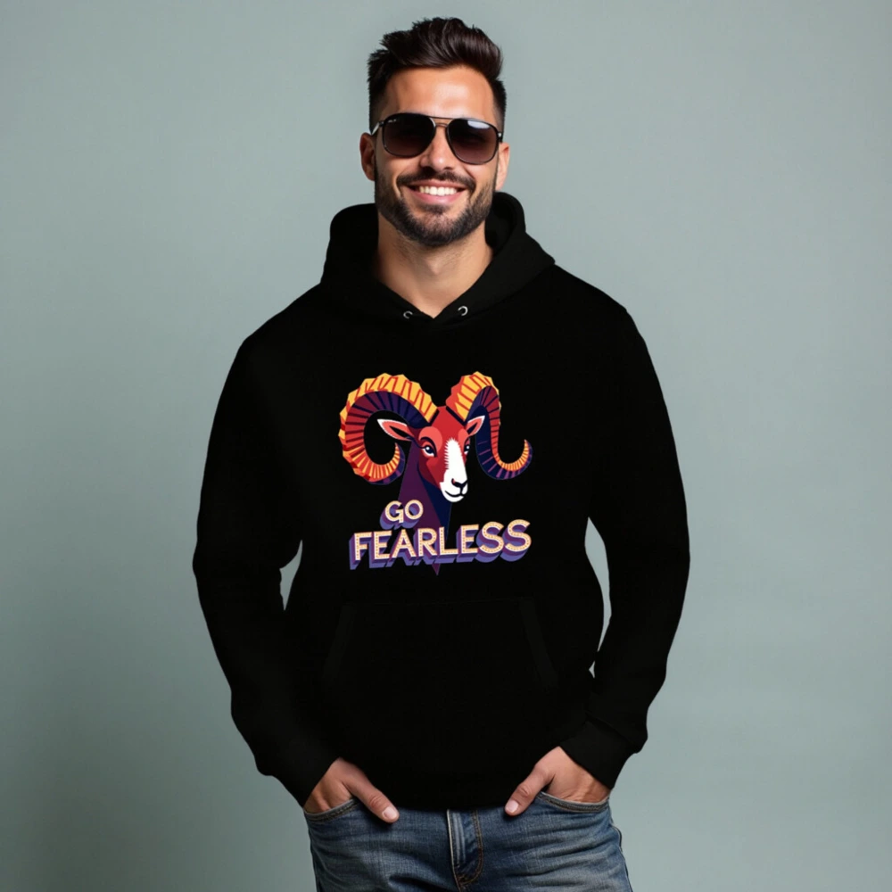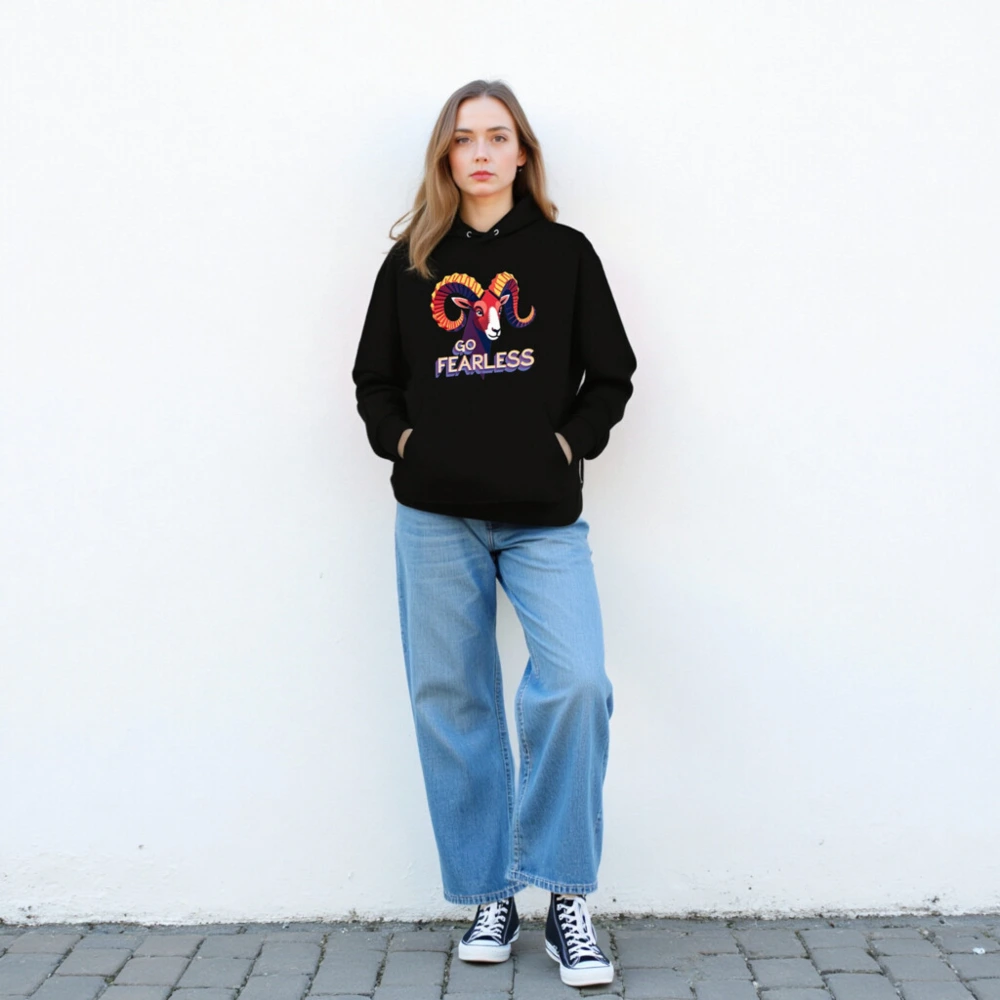 Wear confidence with our Go Fearless unisex essential eco hoodie — featuring a vibrant ram graphic and bold ‘GO FEARLESS’ typography. Made for comfort and sustainability, this essential hoodie combines stylish design with everyday wearability. Perfect for those who embrace courage and individuality. Lightweight, soft, and built to last — your fearless statement piece.