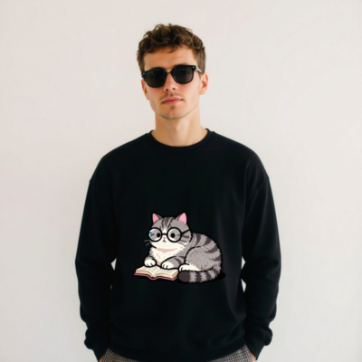 Adorable gray tabby cat wearing glasses, peacefully reading a book—cute and cozy design on this unisex crew neck sweatshirt. Soft, comfortable fit for everyday wear. Perfect gift for book lovers and cat enthusiasts. Classic black base with vibrant print. Machine washable. Size: S-3XL. Designed for casual style with a touch of whimsy.