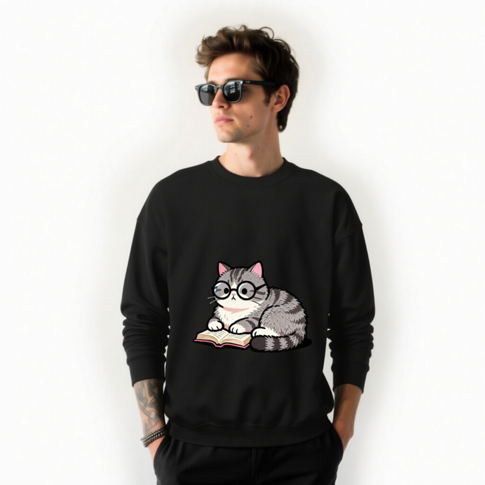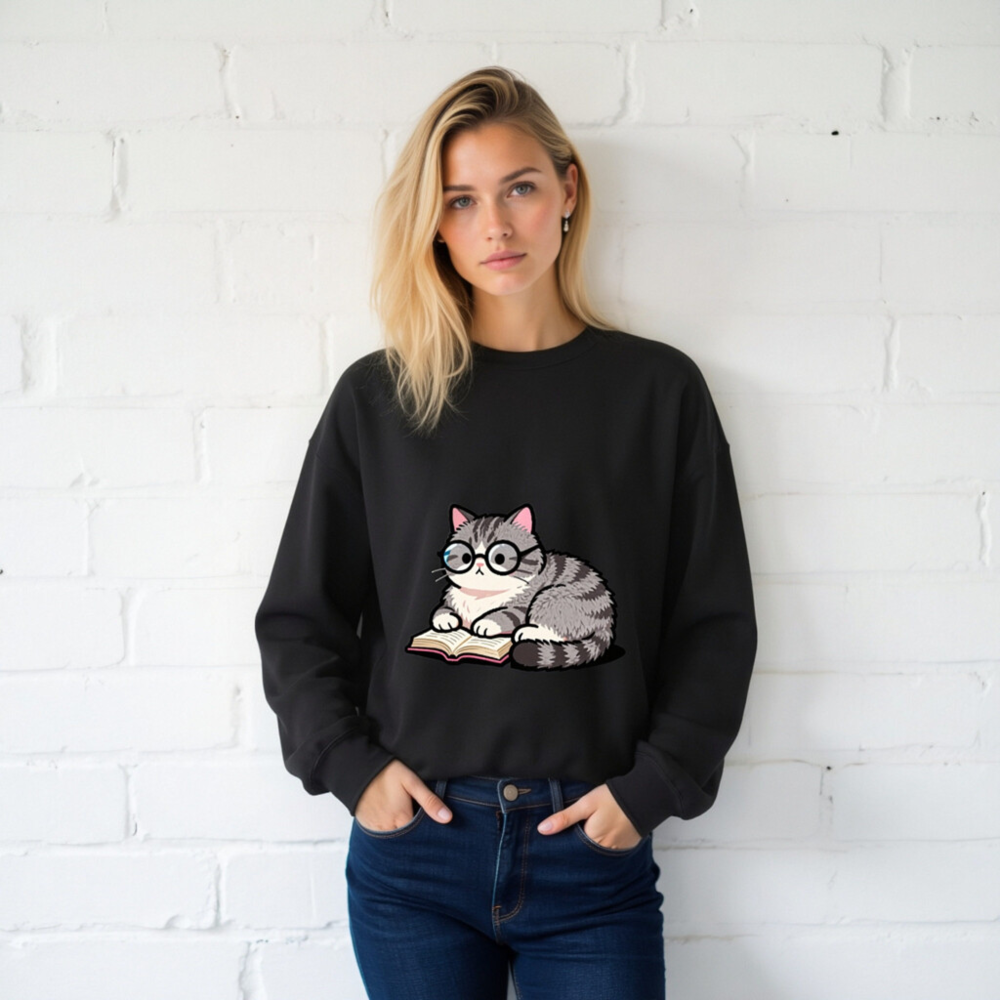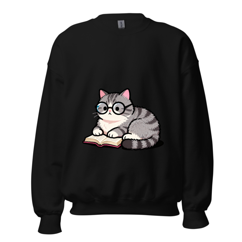 Adorable gray tabby cat wearing glasses, peacefully reading a book—cute and cozy design on this unisex crew neck sweatshirt. Soft, comfortable fit for everyday wear. Perfect gift for book lovers and cat enthusiasts. Classic black base with vibrant print. Machine washable. Size: S-3XL. Designed for casual style with a touch of whimsy.
