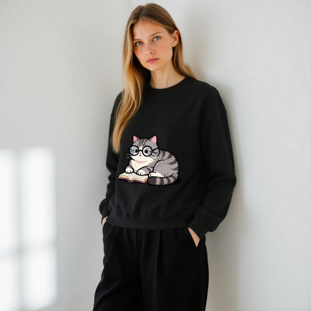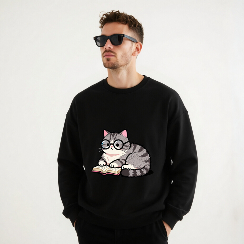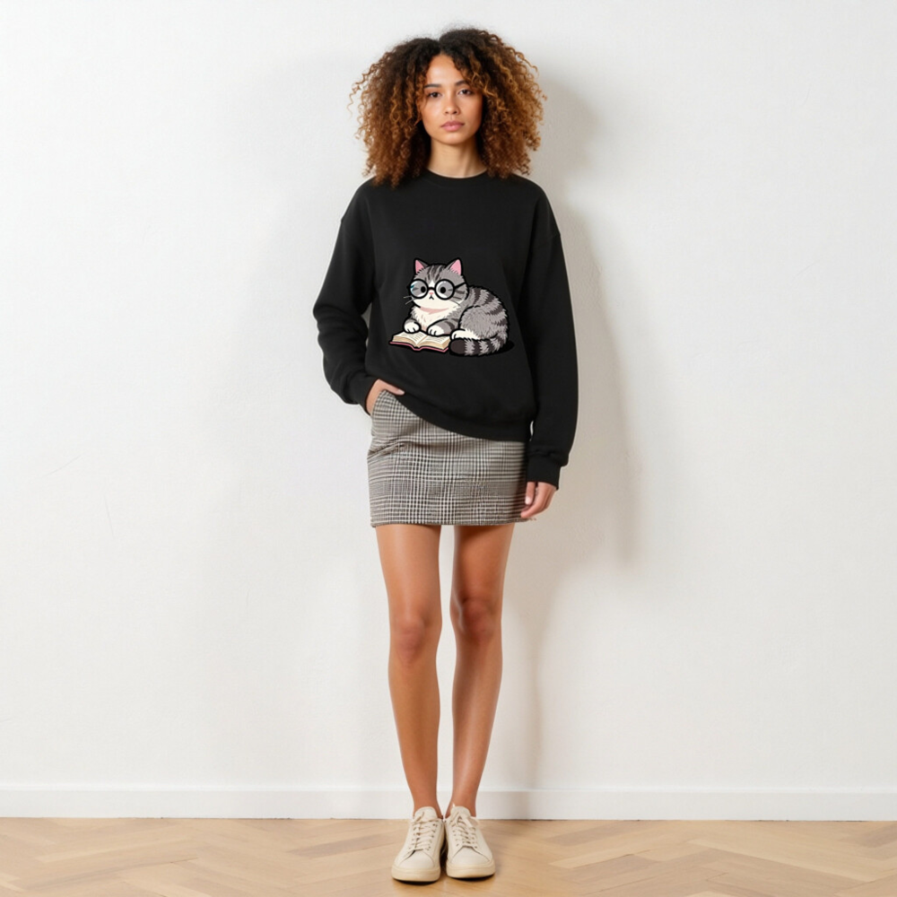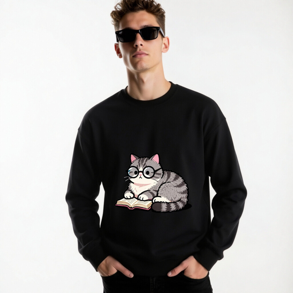 Adorable gray tabby cat wearing glasses, peacefully reading a book—cute and cozy design on this unisex crew neck sweatshirt. Soft, comfortable fit for everyday wear. Perfect gift for book lovers and cat enthusiasts. Classic black base with vibrant print. Machine washable. Size: S-3XL. Designed for casual style with a touch of whimsy.