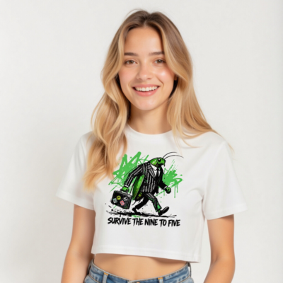 Women’s white crop top featuring a bold green grasshopper in a pinstripe suit carrying a vintage briefcase with stickers. Vibrant graffiti-style green splashes and the phrase ‘SURVIVE THE NINE TO FIVE’ add edgy, motivational flair. Perfect for office rebels, creative professionals, and anyone who loves quirky, statement fashion. Short sleeve, relaxed fit, high-quality cotton blend.