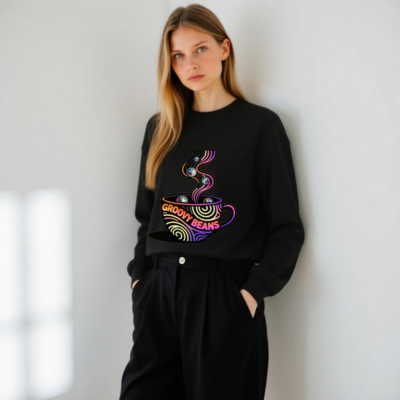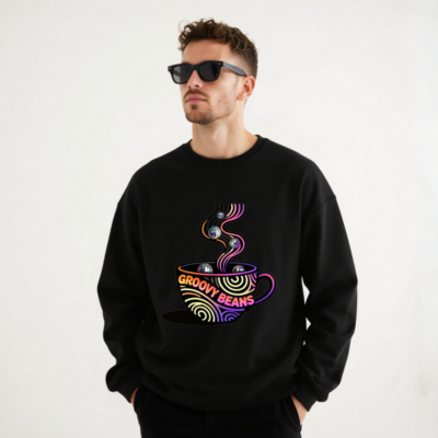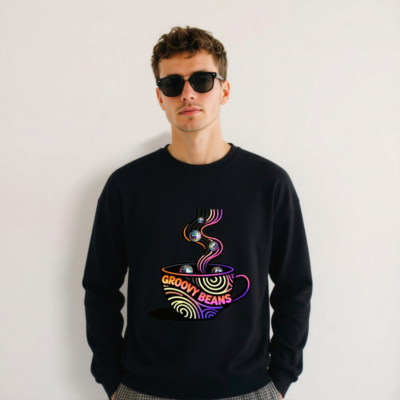 Vibrant ‘Groovy Beans’ disco-themed sweatshirt featuring a colorful coffee cup with swirling rainbow steam and reflective disco balls. Unisex crew neck design, soft comfortable fit. Perfect for retro lovers, coffee enthusiasts, and dance culture fans. Bold 80s-inspired graphic—fun, eye-catching, and ready to groove.