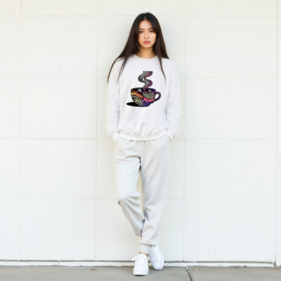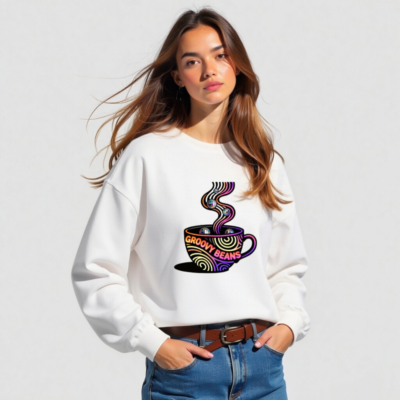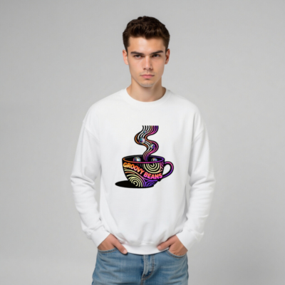 Vibrant ‘Groovy Beans’ disco-themed sweatshirt featuring a colorful coffee cup with swirling steam and reflective disco balls. Unisex crew neck design for casual comfort. Bold retro-futuristic graphic perfect for coffee lovers and dance enthusiasts. Soft, everyday wear with eye-catching 70s-inspired art.