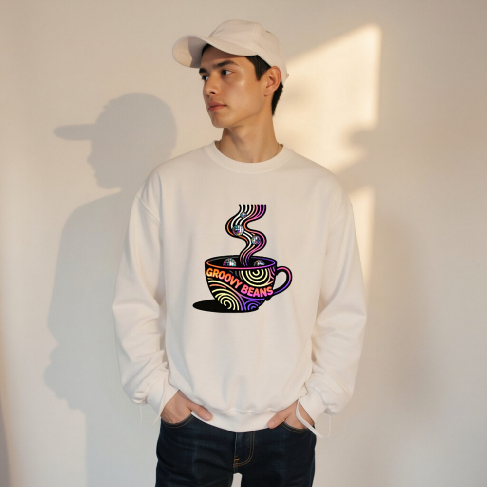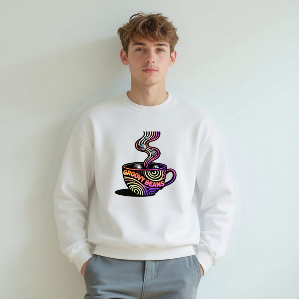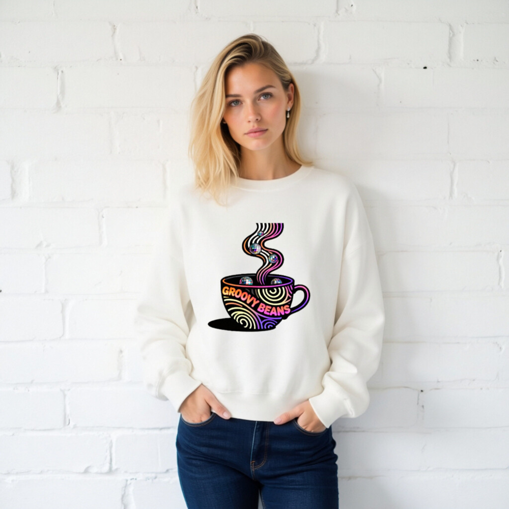 Vibrant ‘Groovy Beans’ disco-themed sweatshirt featuring a colorful coffee cup with swirling steam and reflective disco balls. Unisex crew neck design for casual comfort. Bold retro-futuristic graphic perfect for coffee lovers and dance enthusiasts. Soft, everyday wear with eye-catching 70s-inspired art.