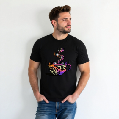 Vibrant ‘Groovy Beans’ design featuring a retro coffee cup with swirling rainbow steam and disco balls—perfect for fans of 70s vibes. Unisex staple t-shirt, soft cotton blend, classic fit. Ideal for casual wear, music lovers, and coffee enthusiasts. Bold, eye-catching print with nostalgic groovy aesthetic.