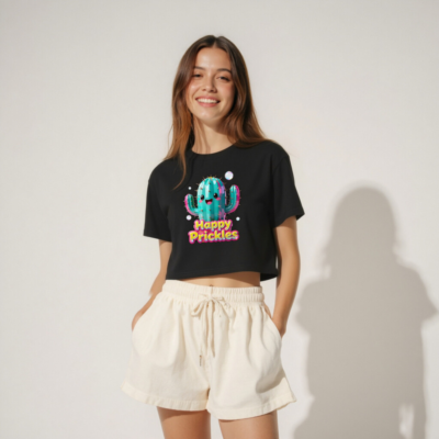 Adorable women’s crop top featuring a vibrant, kawaii-style cactus with ‘Happy Prickles’ text in bold, colorful font. Made from soft, comfortable fabric with a relaxed fit and stylish cropped hem. Perfect for casual wear, festivals, or gifting. Designed to delight with playful charm and eye-catching details.