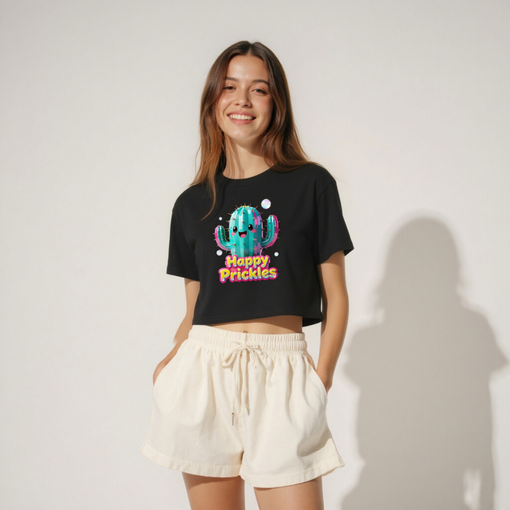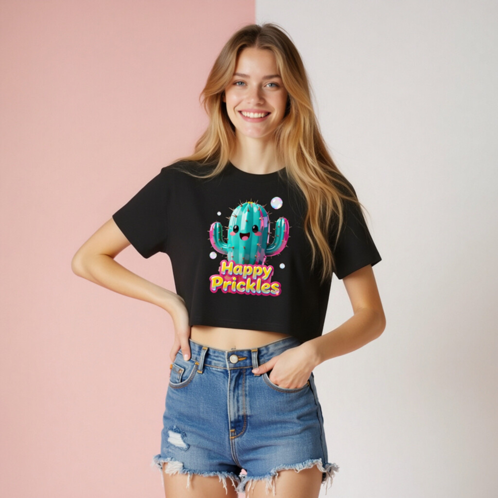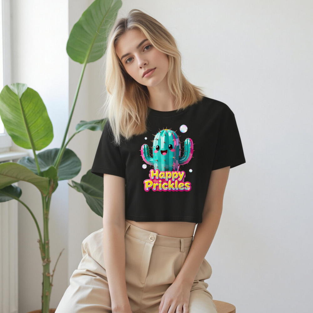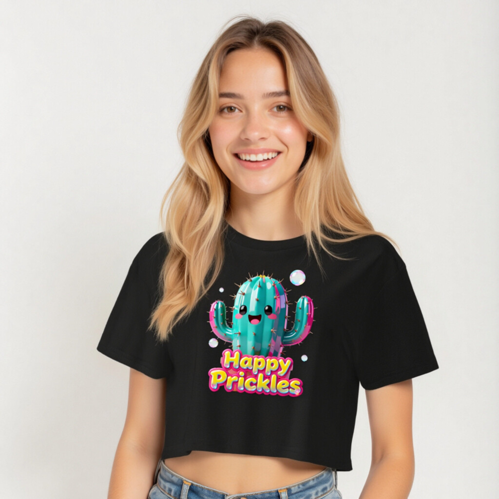 Adorable women’s crop top featuring a vibrant, kawaii-style cactus with ‘Happy Prickles’ text in bold, colorful font. Made from soft, comfortable fabric with a relaxed fit and stylish cropped hem. Perfect for casual wear, festivals, or gifting. Designed to delight with playful charm and eye-catching details.