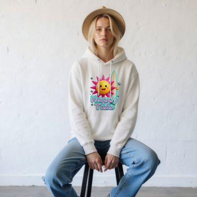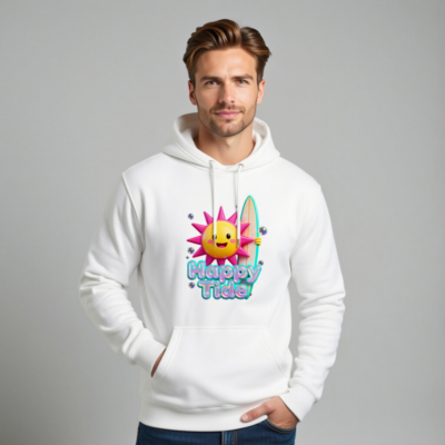 Show your beach vibe with this unisex premium pullover hoodie featuring a cheerful sun holding a surfboard and ‘Happy Tide’ text. Soft, comfortable cotton blend for everyday wear. Perfect for surf lovers and summer enthusiasts. Designed for all genders, machine washable, and built to last. Embrace sunny days with style.