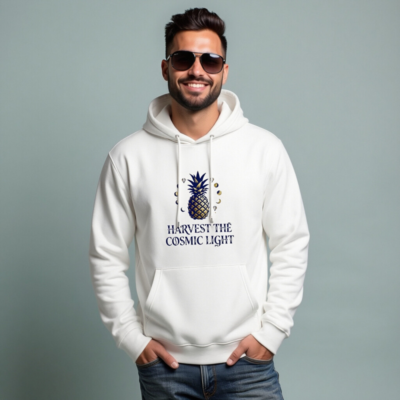 A unisex essential eco hoodie featuring a cosmic pineapple design with moon phases and stars. Made from sustainable materials, this comfortable, versatile sweatshirt combines nature-inspired art with ethical production. Perfect for everyday wear — stylish, planet-conscious, and thoughtfully designed. Harvest the cosmic light, one mindful choice at a time.