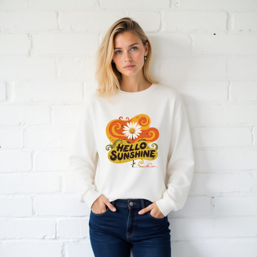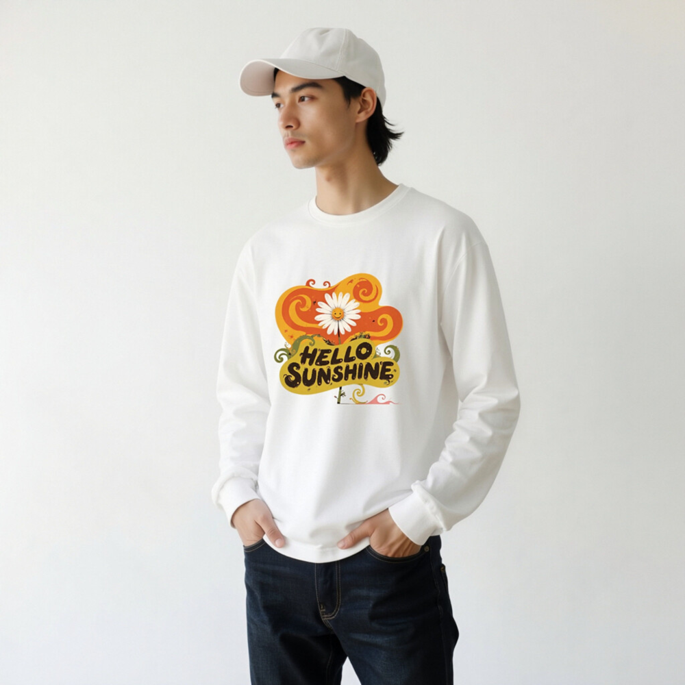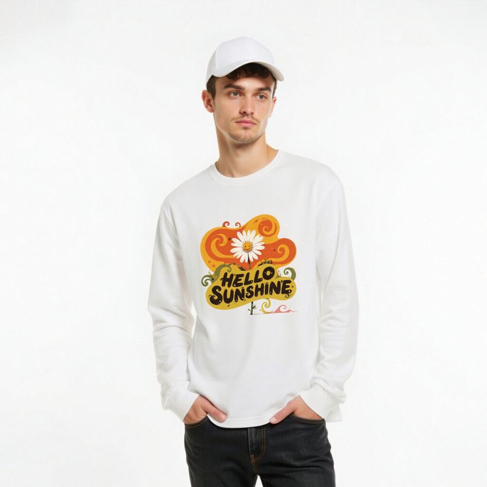 Brighten your day with this cheerful ‘Hello Sunshine’ unisex long sleeve tee. Features a vibrant daisy with smiley face, retro swirls in orange and yellow, and bold text on a clean white base. Soft cotton blend for comfort, versatile fit for all genders. Perfect for casual wear, spring/summer, or as a joyful gift. Designed for everyday positivity.