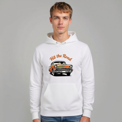 Showcase your love for vintage cars with this unisex essential eco hoodie featuring a bold ‘Hit the Road’ graphic and a retro orange/green classic car design. Made from sustainable materials, it’s soft, comfortable, and perfect for casual wear. Ideal for road trip lovers and car enthusiasts seeking style with purpose.