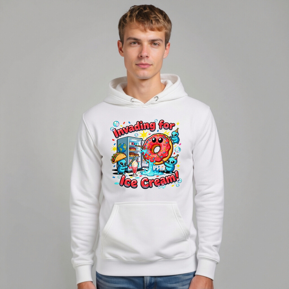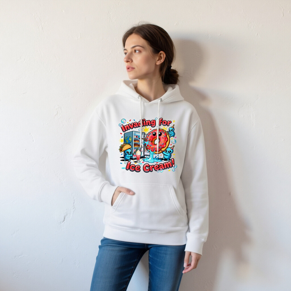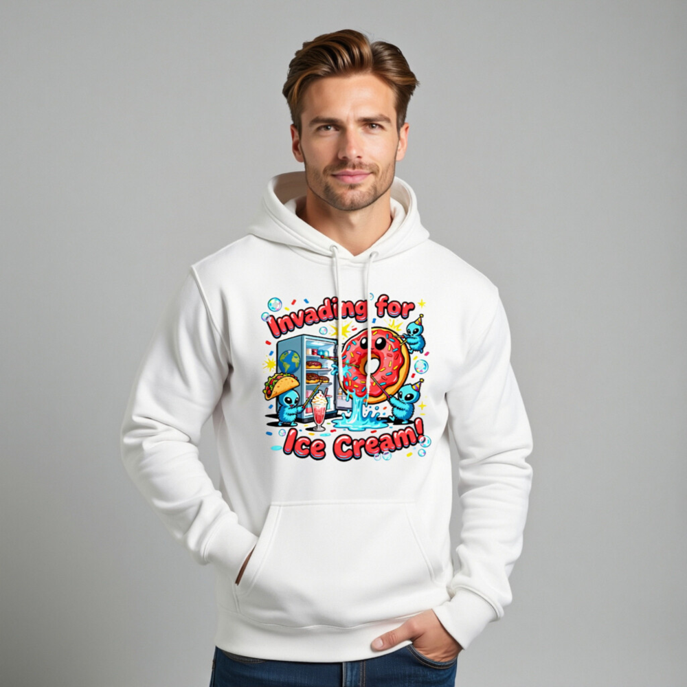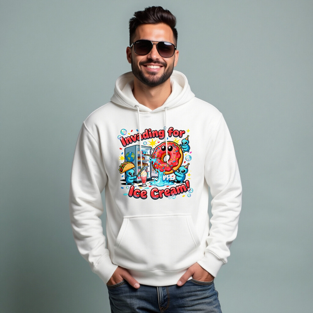 Show off your love for sweet treats with this playful unisex premium pullover hoodie. Featuring a vibrant ‘Invading for Ice Cream!’ graphic—complete with kawaii aliens, a smiling donut, taco, milkshake, and fridge—this cozy hoodie blends humor and comfort. Made for everyday wear, it’s perfect for ice cream lovers, pop culture fans, and anyone who enjoys whimsical, eye-catching apparel.