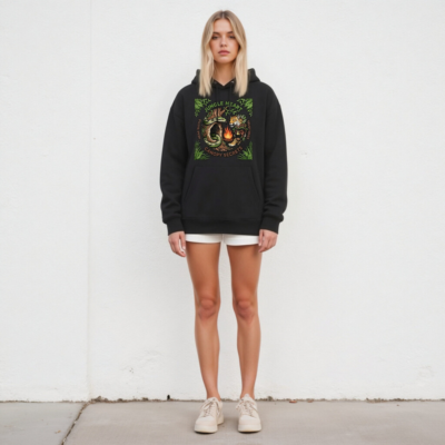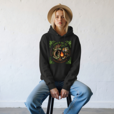 Discover the Jungle Heart Unisex Essential Eco Hoodie — crafted from certified organic cotton for comfort and sustainability. This black hoodie features a vibrant jungle-themed graphic with snake, jaguar, mask, and campfire motifs, embodying ‘Canopy Secrets’ and ‘Hear Rustle, Trust Vines’ spirit. Ideal for eco-conscious adventurers seeking style and ethical wear.