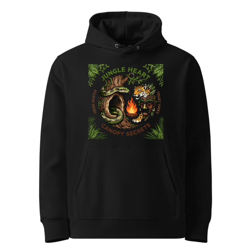 Discover the Jungle Heart Unisex Essential Eco Hoodie — crafted from certified organic cotton for comfort and sustainability. This black hoodie features a vibrant jungle-themed graphic with snake, jaguar, mask, and campfire motifs, embodying ‘Canopy Secrets’ and ‘Hear Rustle, Trust Vines’ spirit. Ideal for eco-conscious adventurers seeking style and ethical wear.