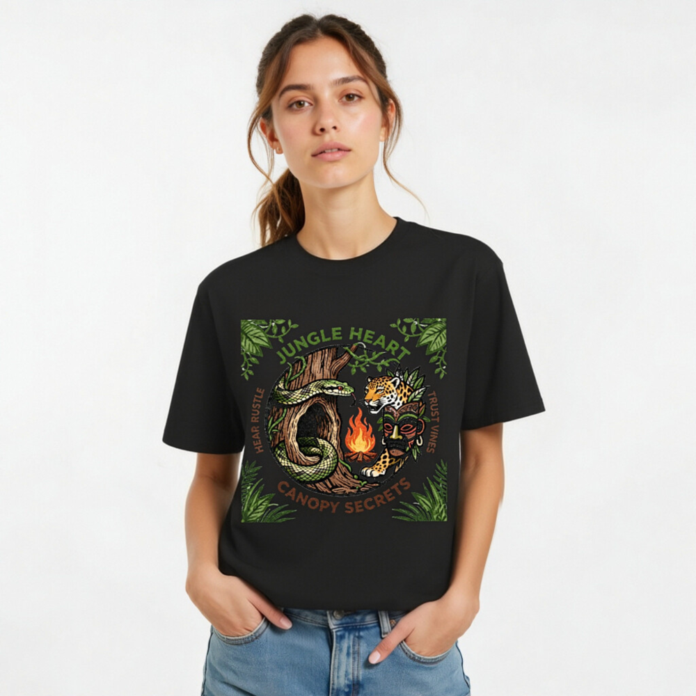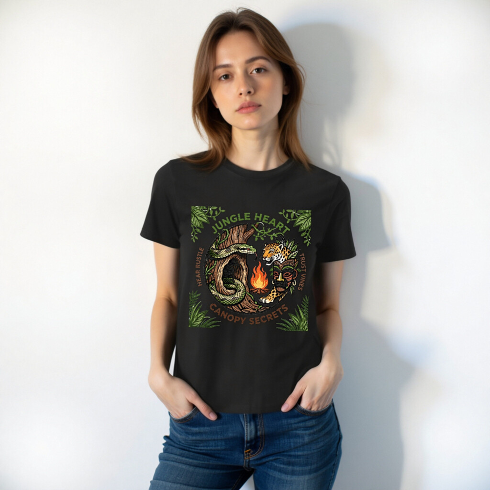 Wear the wild with our Jungle Heart unisex organic cotton t-shirt—soft, breathable, and responsibly crafted. Featuring a vibrant jungle-themed graphic with snake, jaguar, fire, and mask, this design celebrates nature’s mystery. Made from certified organic cotton for comfort and sustainability. Ideal for eco-conscious adventurers seeking style that aligns with values. Free shipping on orders over $50.